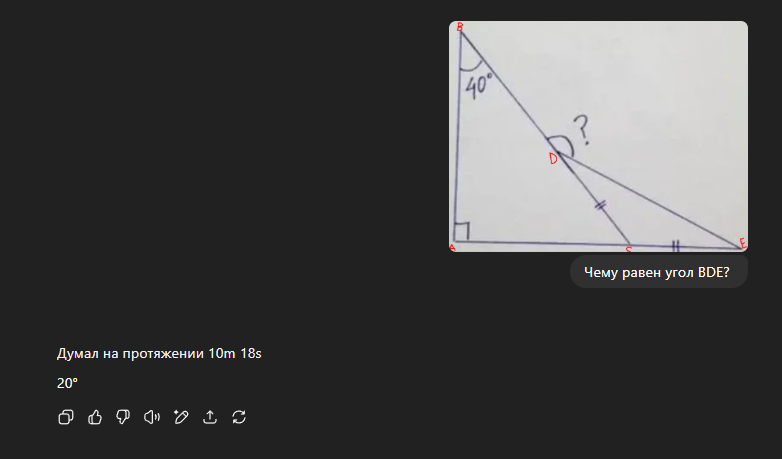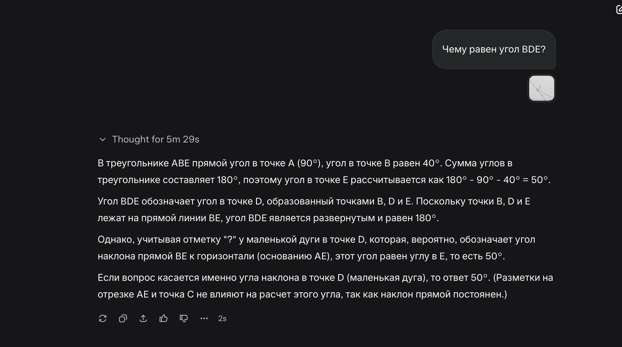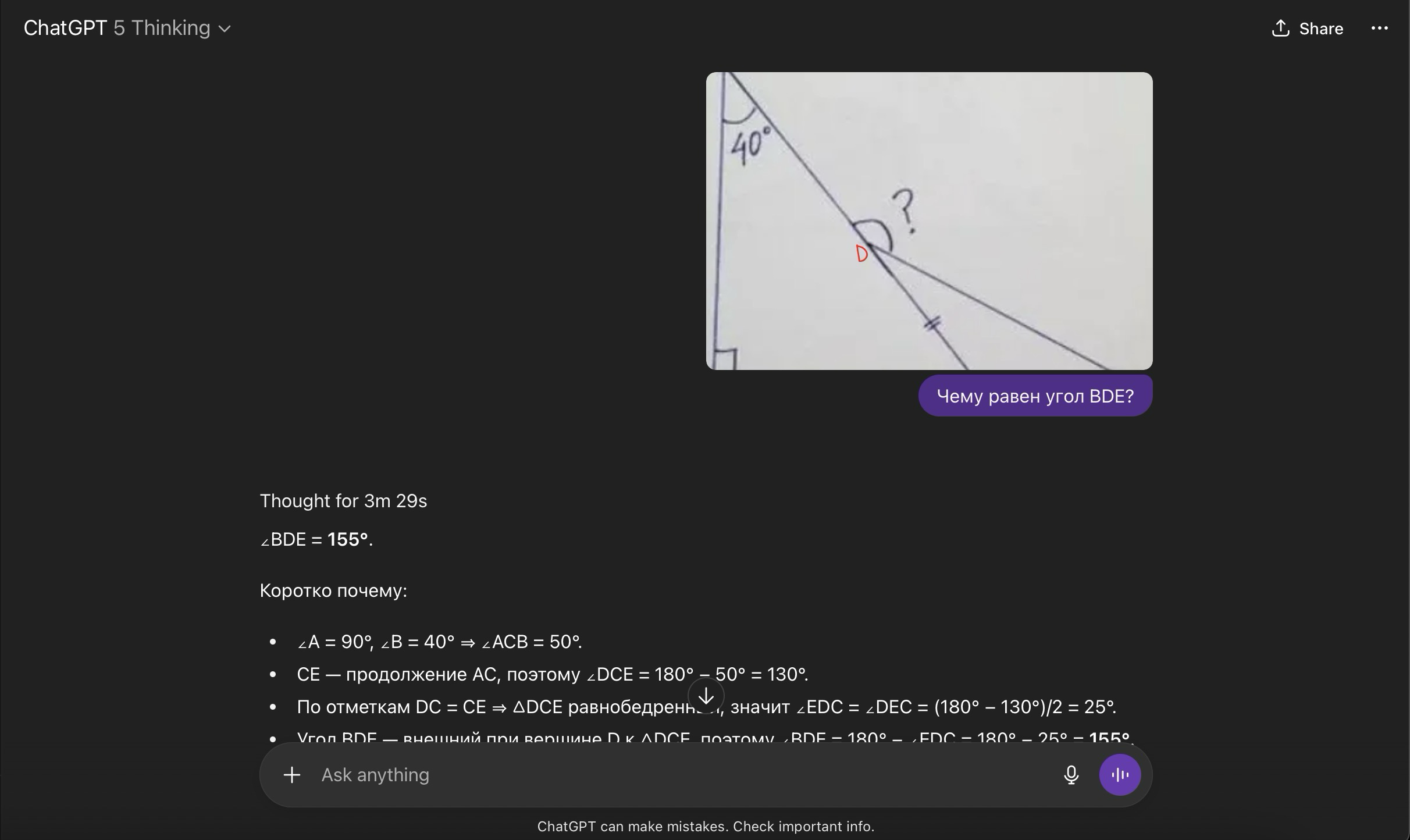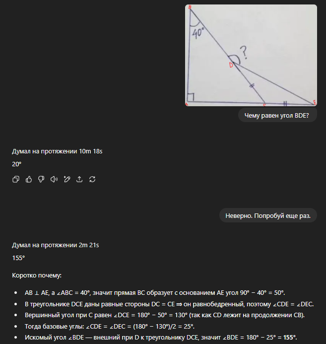 >>1323594 я конечно тоже люблю гпт5, у самомго плюс подписка, но аутист из /б смог решить эту задачку без указания точек. в этом и ценность чертеж бенчмарка: ты описываешь задачу с минимальным контекстом, который понятен школьнику-аутисту и проверяешь на нейронке. иишки еще очень слабы в понимании человека с полу слова в многоэтапных рассуждениях. суть решения в том, что нужно посчитать углы для трех треугольников, последовательно вычитая остаток из 180, так вот без подсказки ии обсираются. теперь как мне быть уверенным в решении многоэтапной задачи, если они тупят на примитивной задаче?