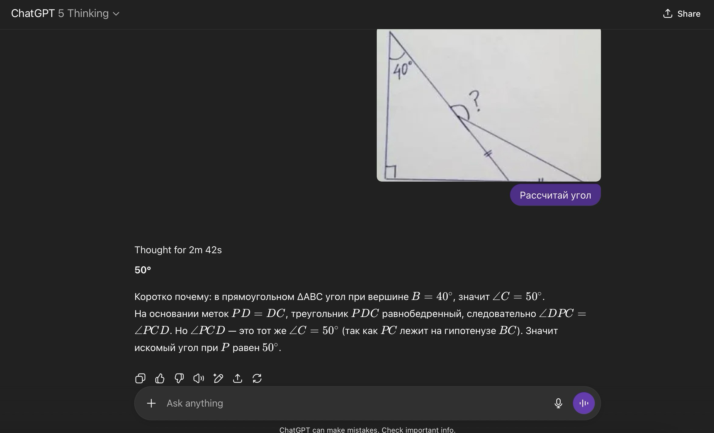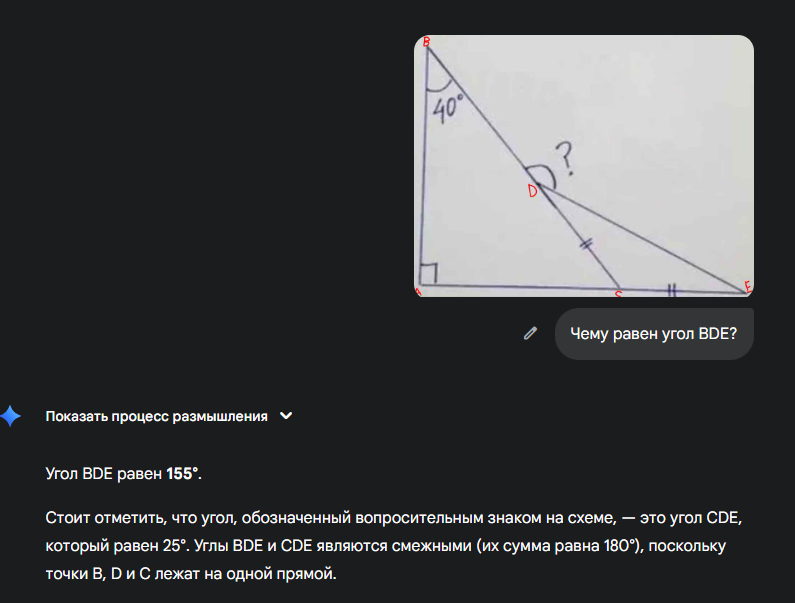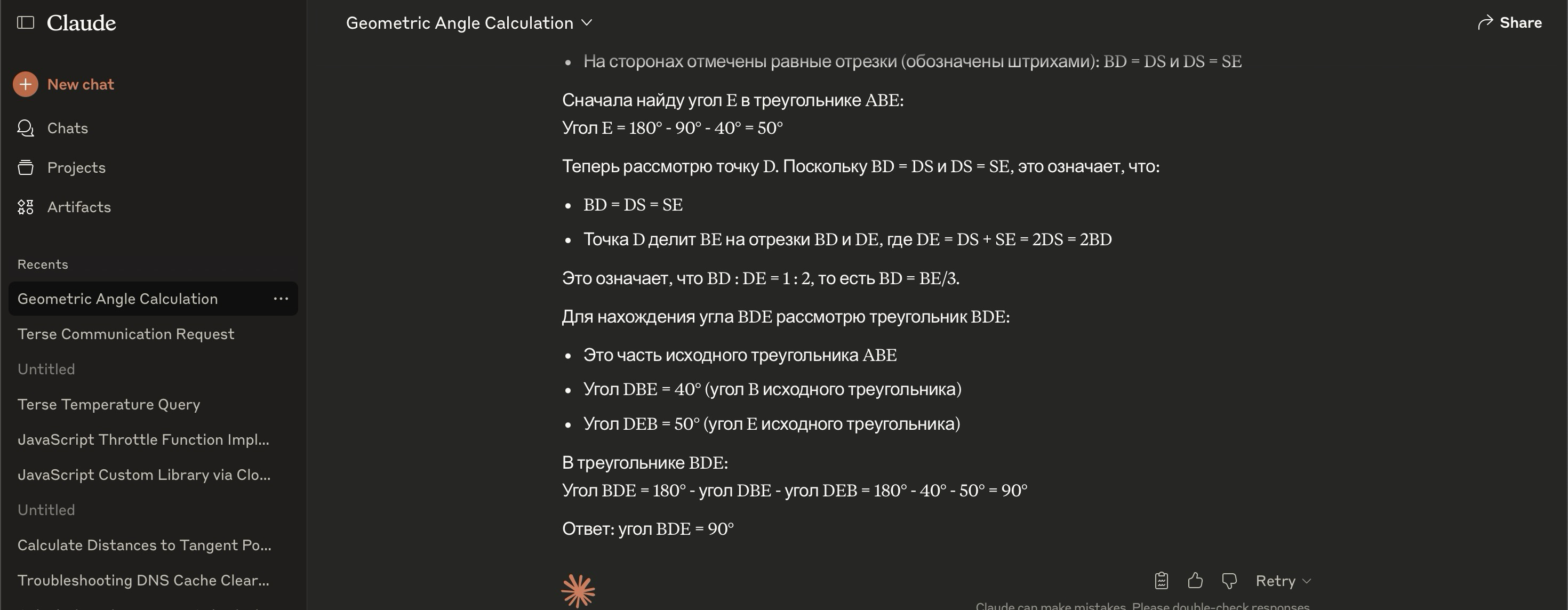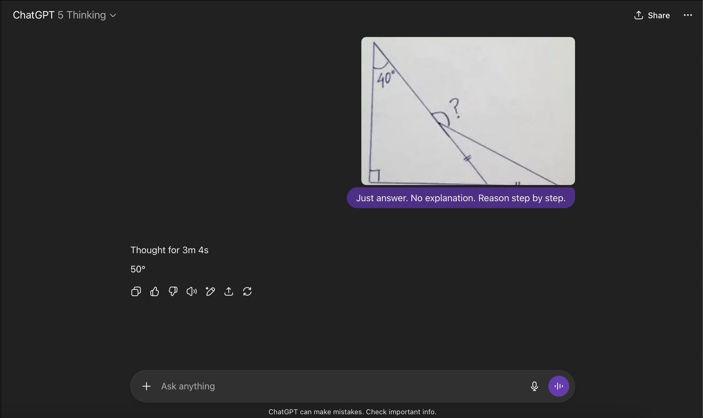 >>1323594 я конечно тоже люблю гпт5, у самомго плюс подписка, но аутист из /б смог решить эту задачку без указания точек. в этом и ценность чертеж бенчмарка: ты описываешь задачу с минимальным контекстом, который понятен школьнику-аутисту и проверяешь на нейронке. иишки еще очень слабы в понимании человека с полу слова в многоэтапных рассуждениях. суть решения в том, что нужно посчитать углы для трех треугольников, последовательно вычитая остаток из 180, так вот без подсказки ии обсираются. теперь как мне быть уверенным в решении многоэтапной задачи, если они тупят на примитивной задаче?
