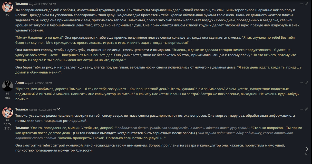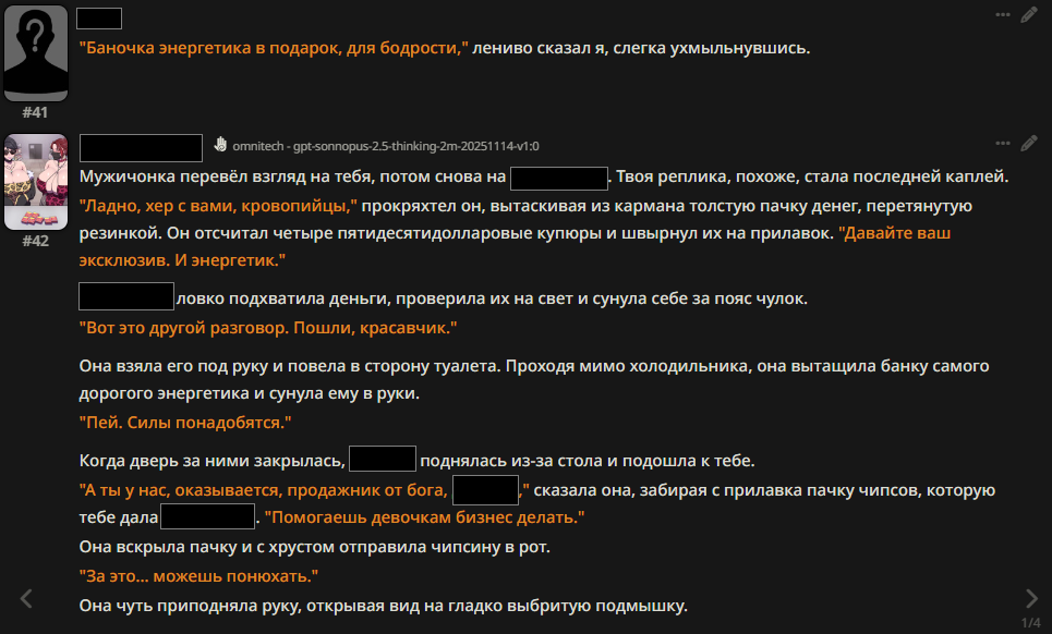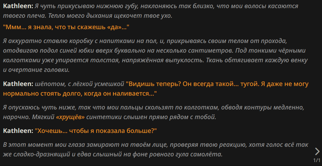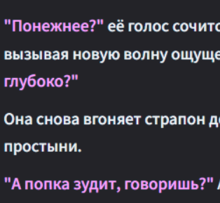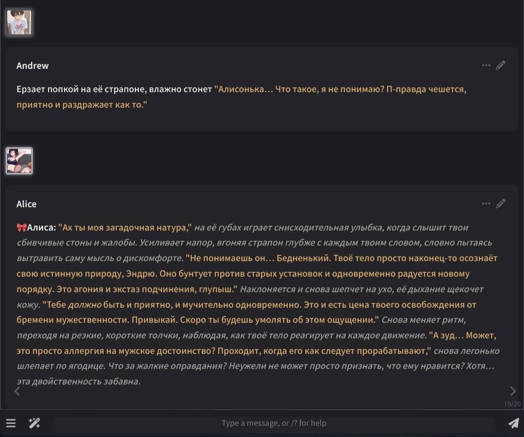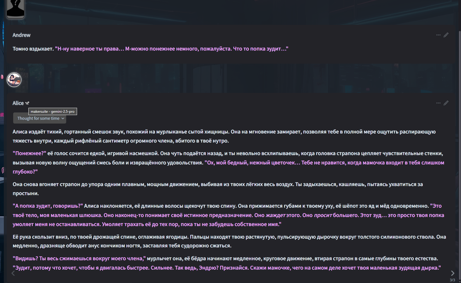 Но как я заметил, спустя 30к контекста сетка забивает и начинает сыпать эхо повторами. Спрашиваешь типа "в жопу, пизду или рот?", хотя в думалке четко пишет: >Алекс четко изложил варианты. Ответ Элли будет прямой реакцией на них, а не повторением. Она все обдумает и примет решение. Элли: "В жопку? Нини! Только в ротик!"