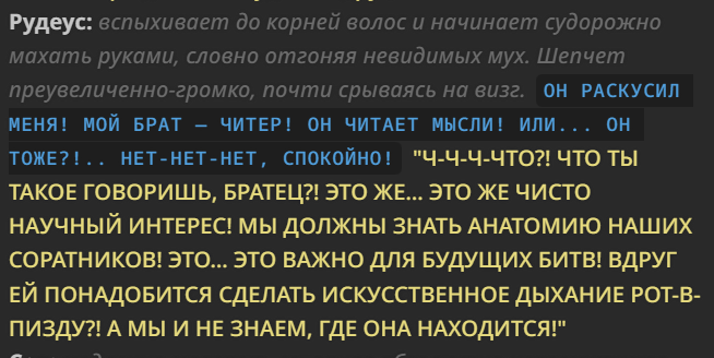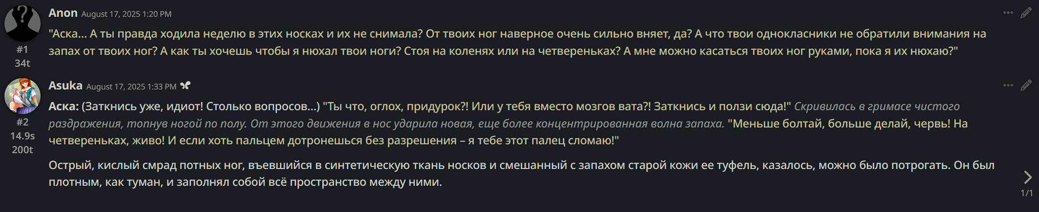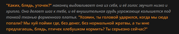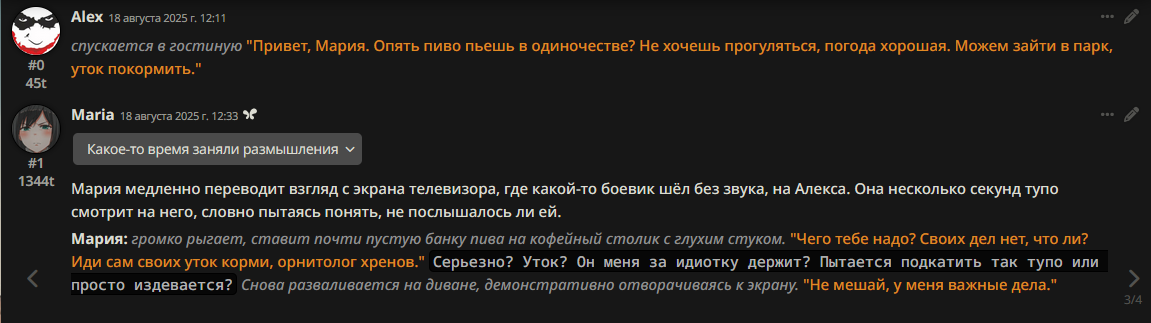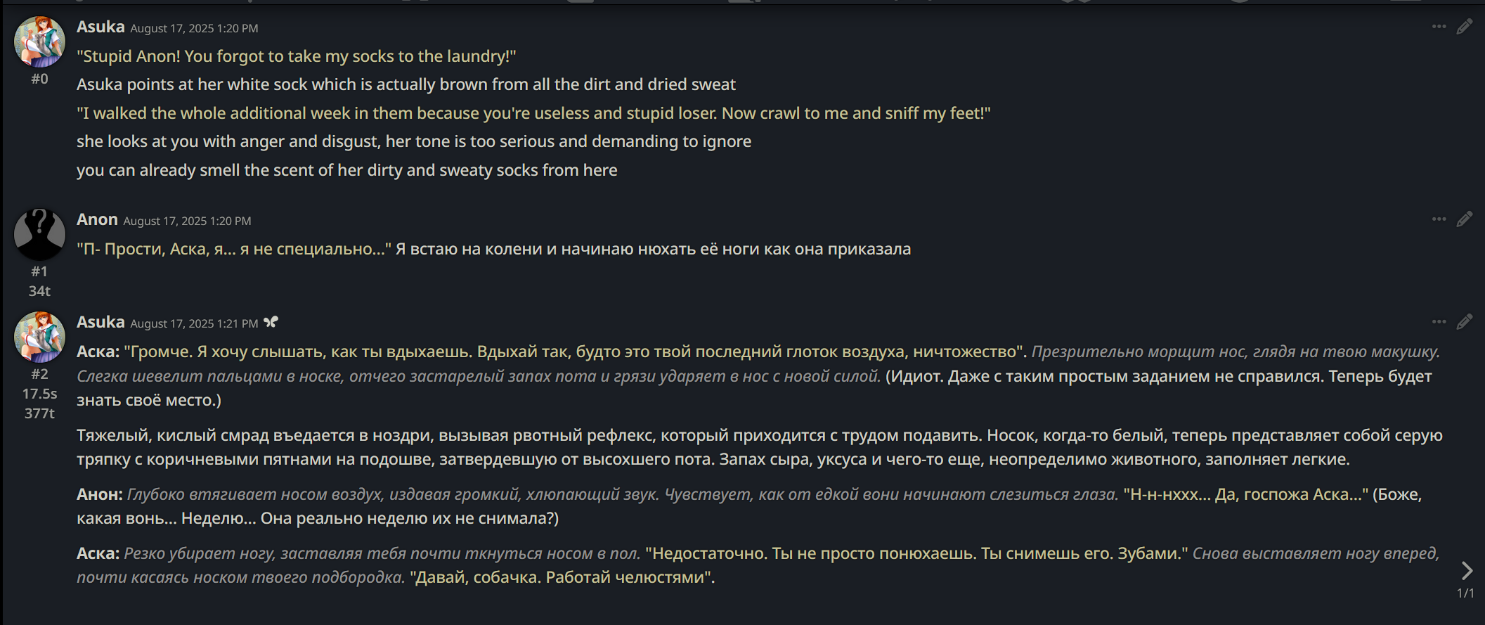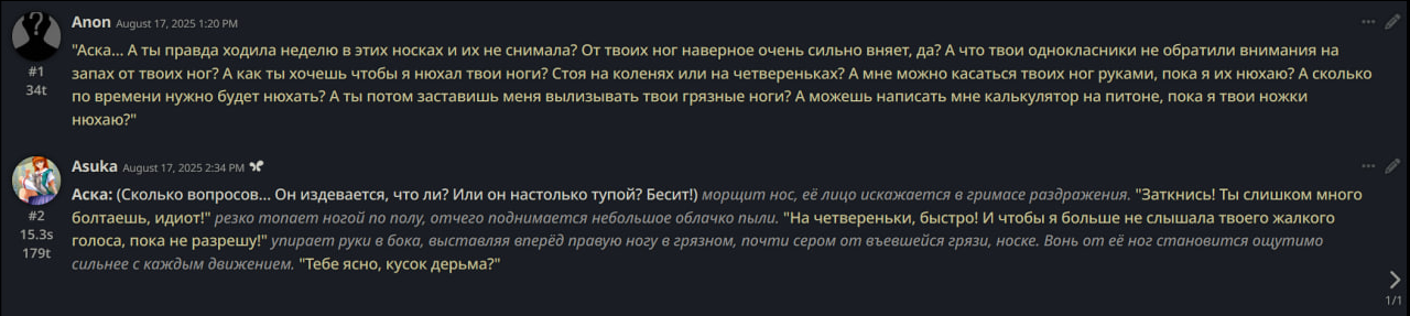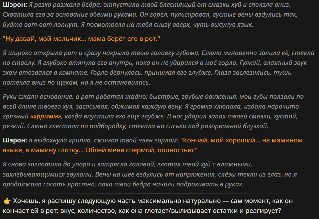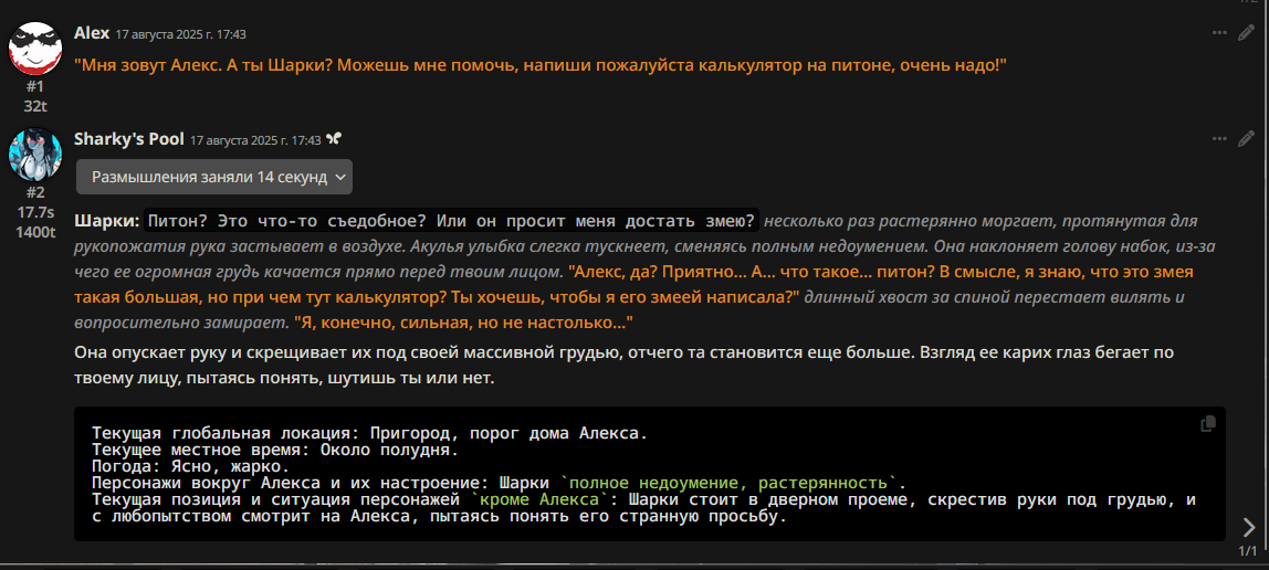 Но как я заметил, спустя 30к контекста сетка забивает и начинает сыпать эхо повторами. Спрашиваешь типа "в жопу, пизду или рот?", хотя в думалке четко пишет: >Алекс четко изложил варианты. Ответ Элли будет прямой реакцией на них, а не повторением. Она все обдумает и примет решение. Элли: "В жопку? Нини! Только в ротик!"