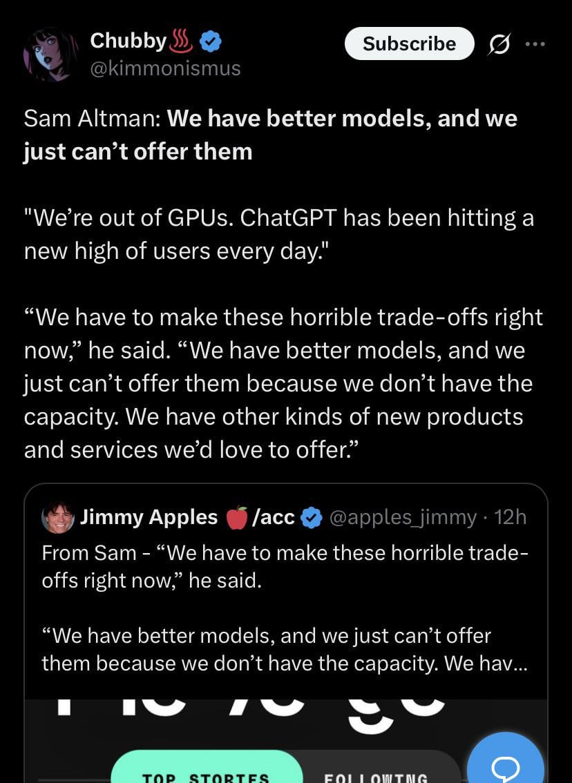 Все это значит, что опенов скоро сильно выебет гугл, ибо у них много своего железа и они умеют в качественный код и оптимизон, либо Маск, потому что грок сейчас нахуй никому не нужен, значит ресурсы пойдут под плотный ресерч и тренировку большой модели, чисто для имиджа.
