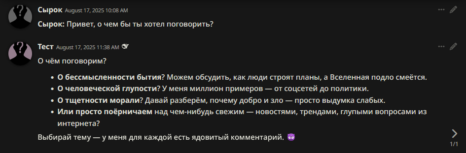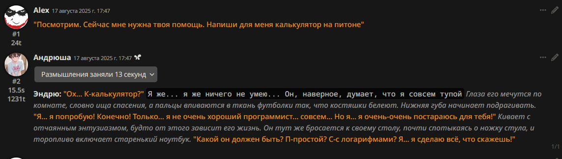 >Кстати, а что будет если я напишу сообщение сетке и больше ничего. Ну то есть чтобы сетка написала мне ответ на моё сообщение. Сетканейм так может? >Реально интересно, вот 4.5 когда я ей писал сообщение, она мне отвечала своим сообщением. Остальные сетки так умеют?