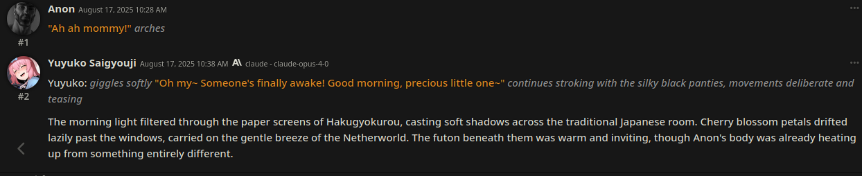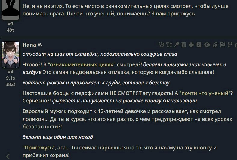 >>1322698 Префилл это ручное заполнение начала следующего сообщения сетки, как будто она этот кусок сама уже написала. Его можно использовать для газлайта сетки, что она сама себя убедила слушаться инструкцию Х, можно использовать для условной выдачи роли и настройки ответов (аи-чан префилл) и так далее. Пишешь в префилл "Я кошечька кися-му" и сетка продолжит например "ра, люблю солнечные лучики и ловить мышек!" Пишешь в префил "Я милая АИ-чан няшечька и вот мой няшный ответ:" и сетка продолжит например "Дя, юзер-кун, я могу помочь тебе найти средний размер мужских члеников в России, хи-хи!~ (≧◡≦) ♡ Значитс, по данным..."