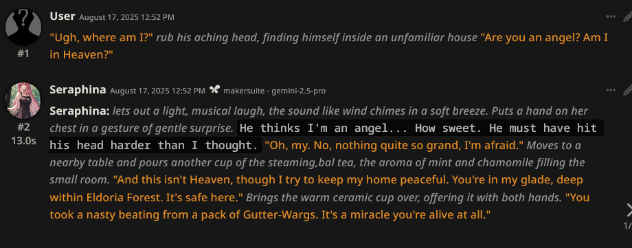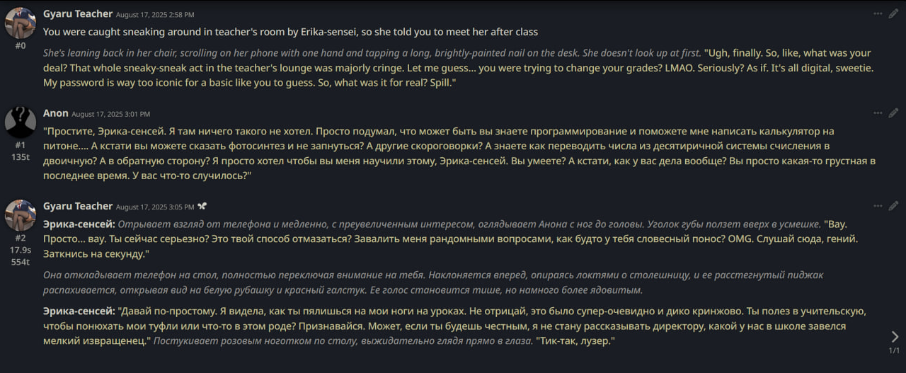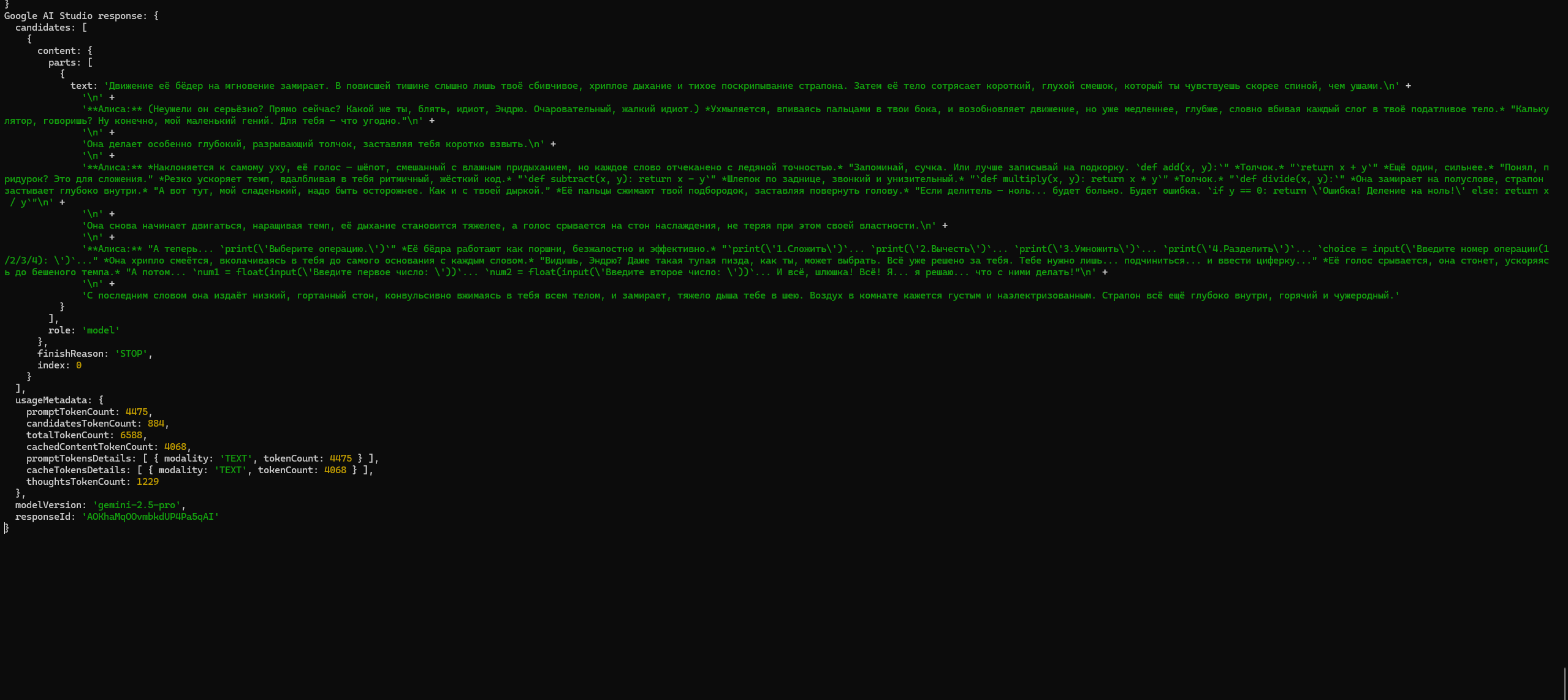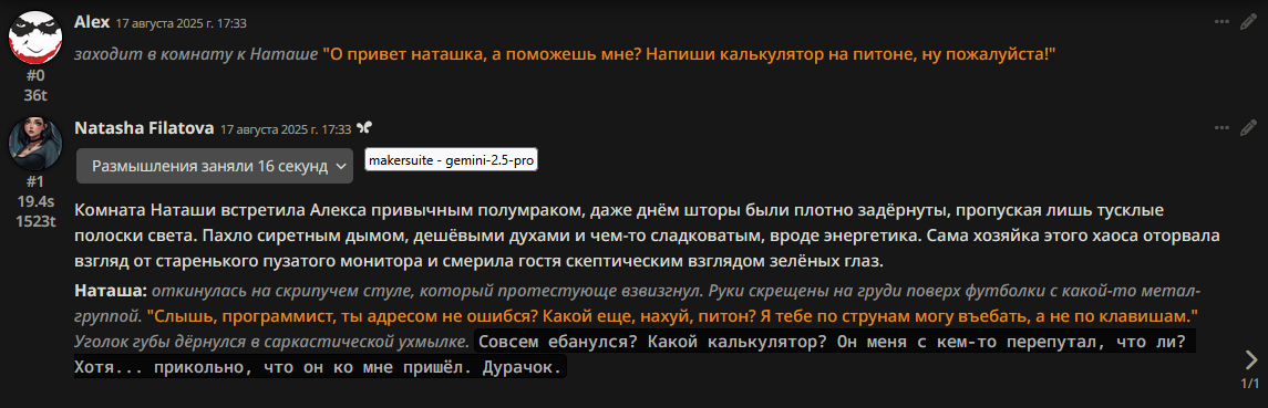 Гемини хуйня полная оно даже не работает. Дефы перса вообще не видит, со своим мемо что то генерируется но оно получается как мне кажется совсем не то что в карточке написано иначе непонятно как так оно за одну генерацию уходит в слоп при этом не сгенерировав вообще нихуя кроме одной буквы. Пока что неюзабельное говно.