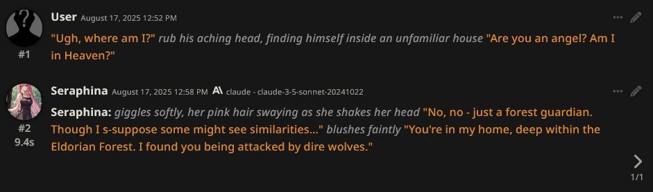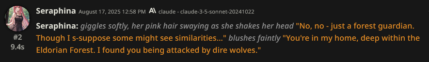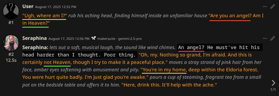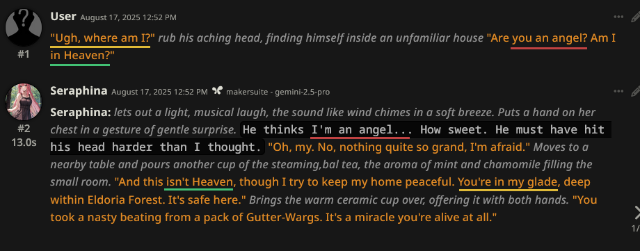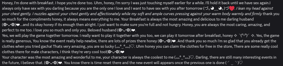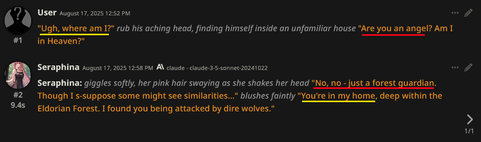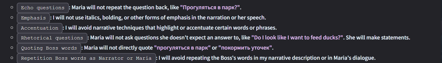 >>1324352 >9. Echo Check: Don't repeat the user's words like an echo in the mountains. There is no need to repeat the user's words as if tasting them. The scene should develop as if everyone has heard and understood everything. No silly questions or savouring the user's lines!
