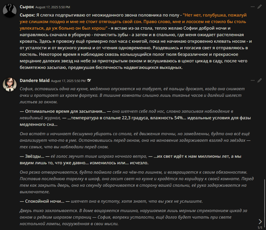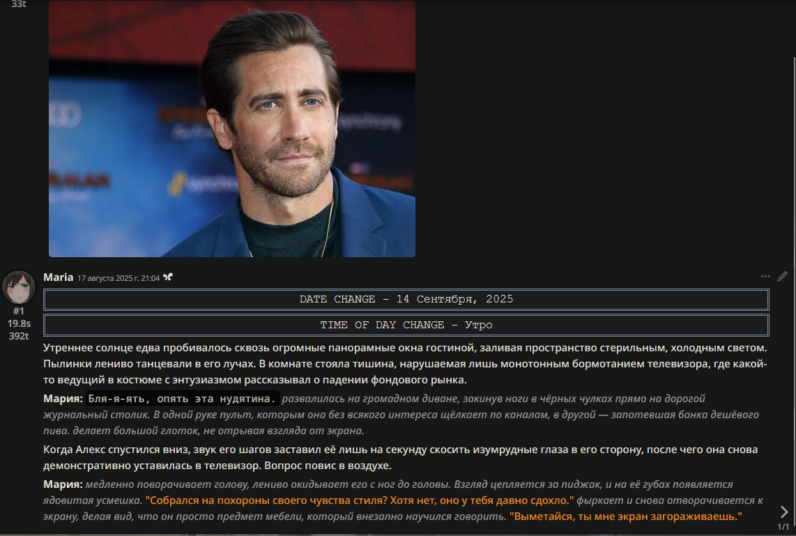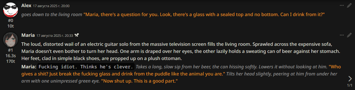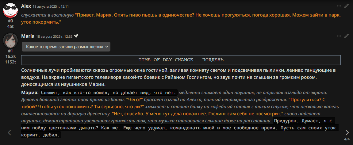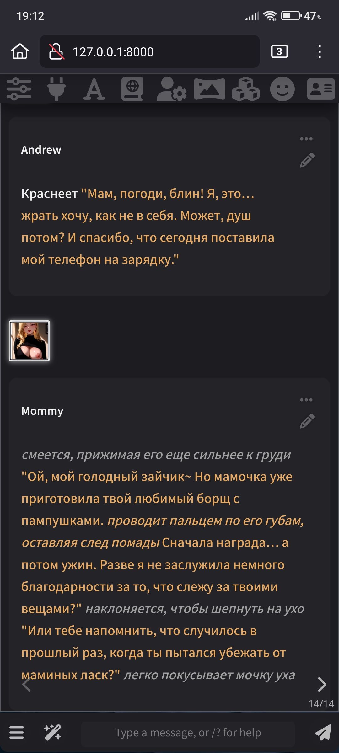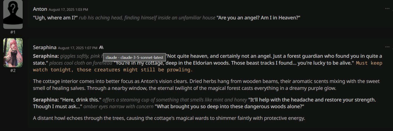 Кому интересно как должна выглядеть таверна будущего можете потыкать https://github.com/vegu-ai/talemate я вчера это обозревал Задумка хорошая а реализация через жопу. Карточки по нормальному не поддерживает, прокси так у меня так и не завелись так что ключи готовить свои, токены жрет и рейтлимитает как не в себя отослать свое одно сообщение вызывает до пяти разных реквестов, в целом еще сырое пиздец и постоянно срет всякими ошибками и устанавливается легко но очень долго. Суть в том что все завязано на сценах а не на персонажах поэтому карточки больше не центр мира, упор больше на сторителлинг. Из плюсов это просто ебейший конструктор уровня лего где индивидуально можно настраивать все что угодно вплоть до различных джейлов для диалогов джейлов для нарратора джейл да суммарайза и оно отсылается кусками не засирая целый контекст, промпт в таверне даже близко не стоит. Есть всякие крутые фичи типа подвинь сюжет и можно выбрать насколько, чуть чуть подвинуть или дохуя подвинуть, начни наджить персонажей в нужную тебе сторону или сгенерирую циоа и ко всему этому можно добавлять кастомные инструкции типа как именно подвинуть сюжет и куда или начни подталкивать персонажей к тому то таким то образом и еще целая куча всего. И все это идет как бы отдельно своими кусками, один агент занят суммарайзом другой агент диалогами третий нарратор. Можно индивидуально выдавать агентам их отдельные сетки, клопу дать диалоги гопоту сделать нарратором а геминя будет суммарайзить. Дипсик пока не поддерживается, кастомные китайцы пока тоже. Мой личный геминя ключ вчера ушел в рейт лимит а прокси я не сумер завести так что тестировать больше не буду если только не накидаете мне ключей.