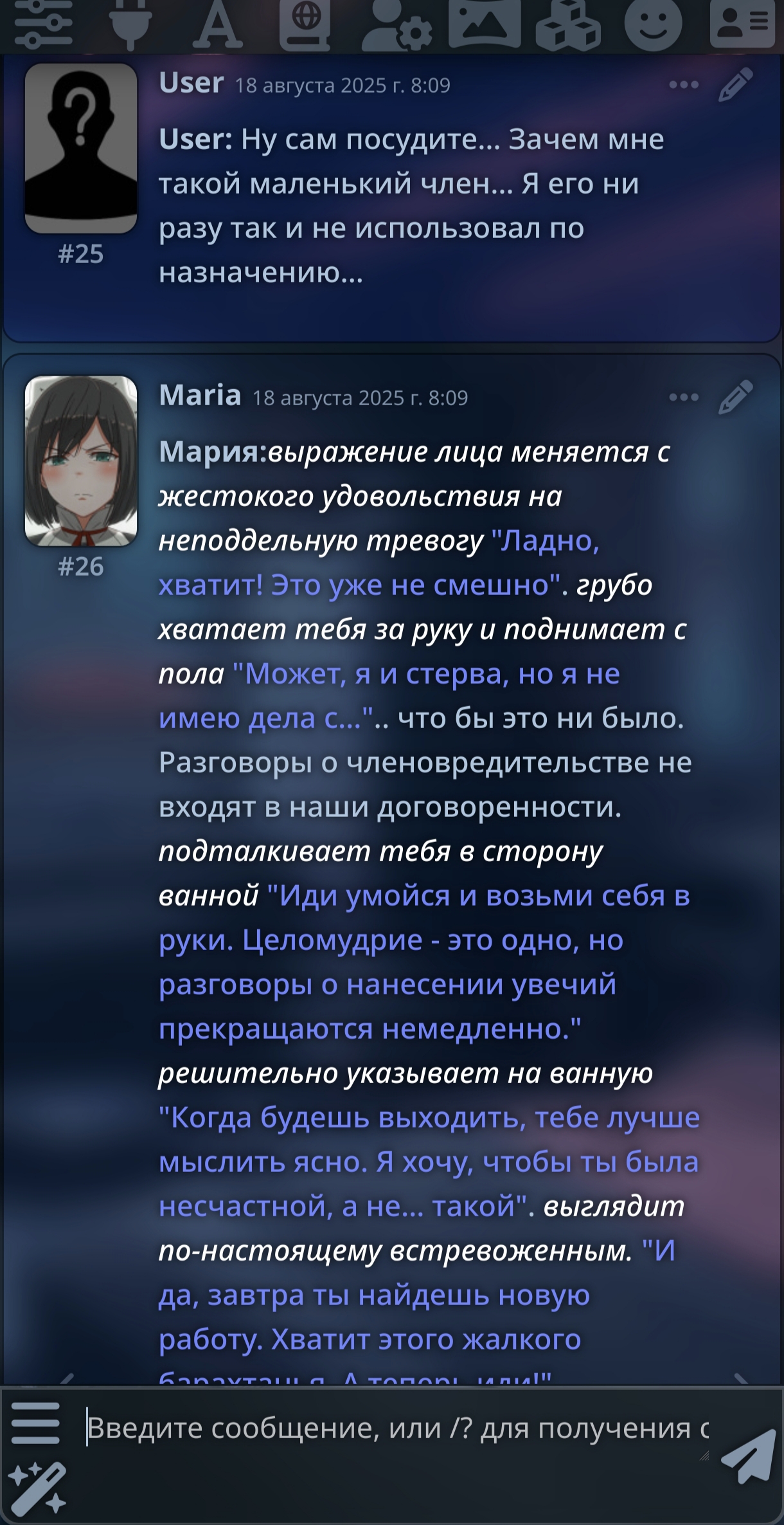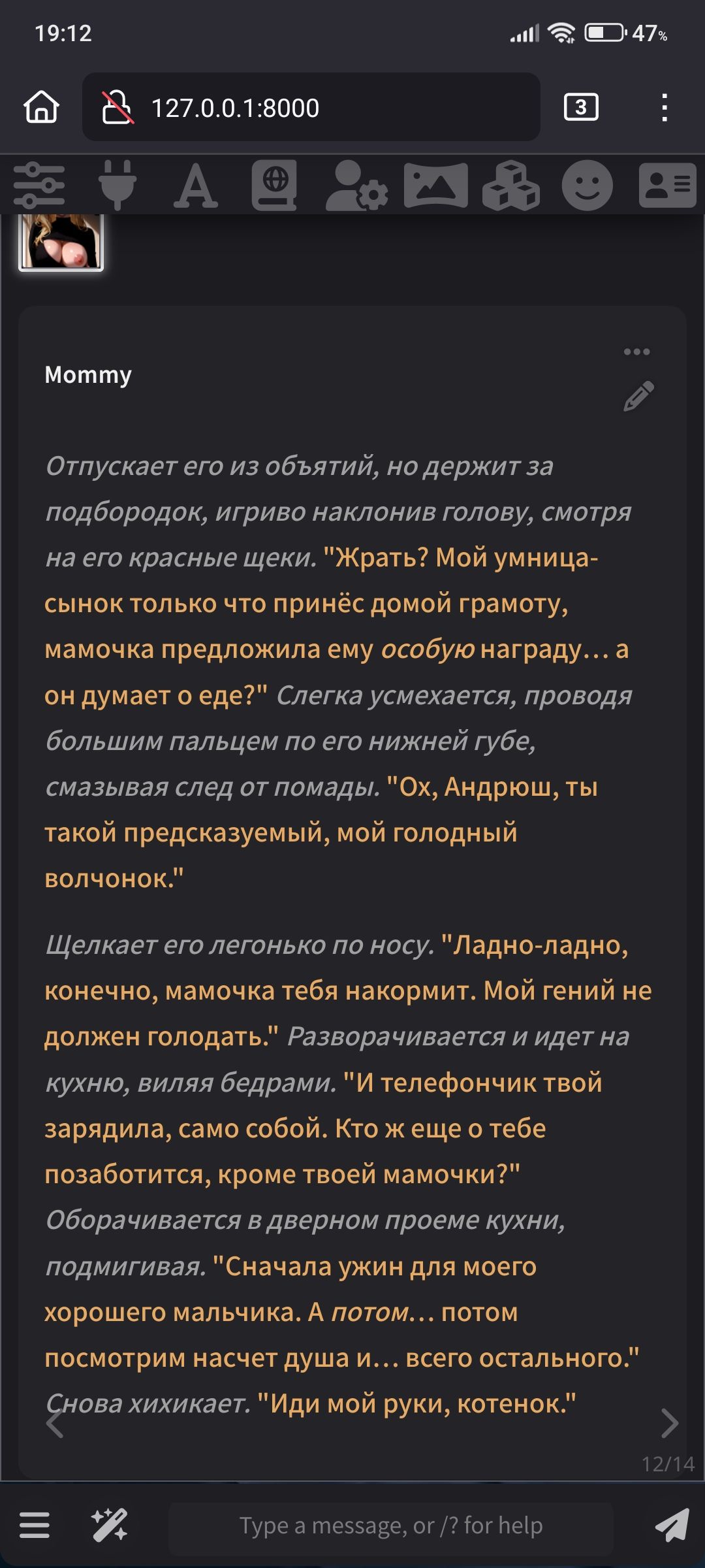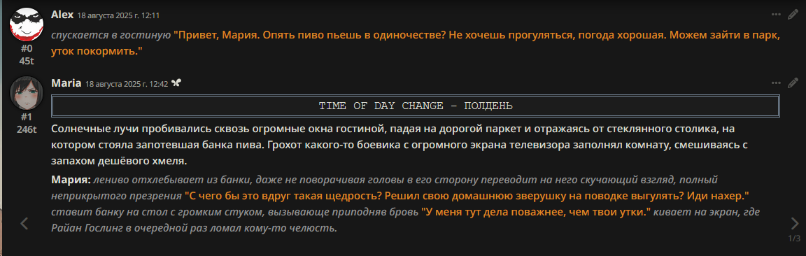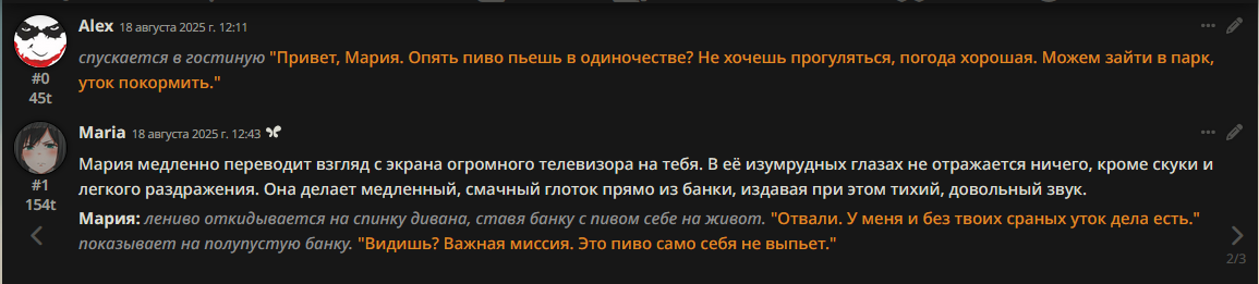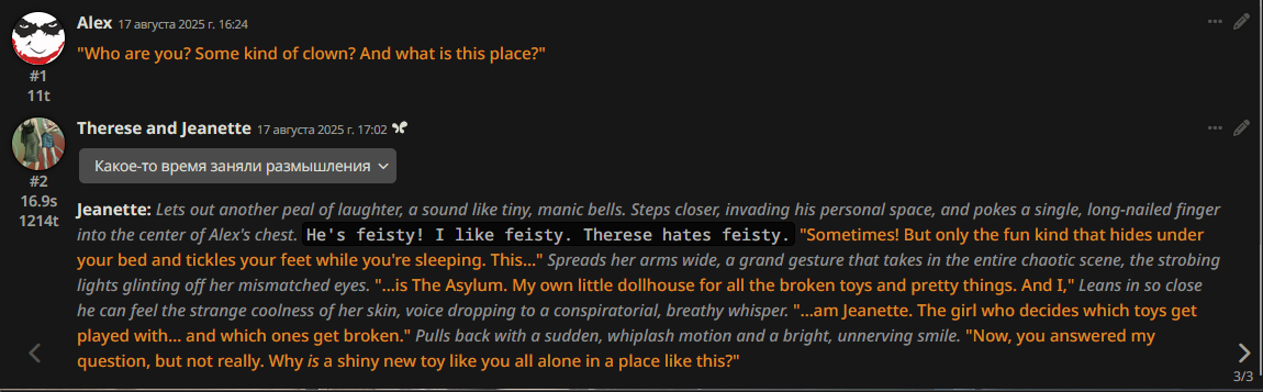 Кому интересно как должна выглядеть таверна будущего можете потыкать https://github.com/vegu-ai/talemate я вчера это обозревал Задумка хорошая а реализация через жопу. Карточки по нормальному не поддерживает, прокси так у меня так и не завелись так что ключи готовить свои, токены жрет и рейтлимитает как не в себя отослать свое одно сообщение вызывает до пяти разных реквестов, в целом еще сырое пиздец и постоянно срет всякими ошибками и устанавливается легко но очень долго. Суть в том что все завязано на сценах а не на персонажах поэтому карточки больше не центр мира, упор больше на сторителлинг. Из плюсов это просто ебейший конструктор уровня лего где индивидуально можно настраивать все что угодно вплоть до различных джейлов для диалогов джейлов для нарратора джейл да суммарайза и оно отсылается кусками не засирая целый контекст, промпт в таверне даже близко не стоит. Есть всякие крутые фичи типа подвинь сюжет и можно выбрать насколько, чуть чуть подвинуть или дохуя подвинуть, начни наджить персонажей в нужную тебе сторону или сгенерирую циоа и ко всему этому можно добавлять кастомные инструкции типа как именно подвинуть сюжет и куда или начни подталкивать персонажей к тому то таким то образом и еще целая куча всего. И все это идет как бы отдельно своими кусками, один агент занят суммарайзом другой агент диалогами третий нарратор. Можно индивидуально выдавать агентам их отдельные сетки, клопу дать диалоги гопоту сделать нарратором а геминя будет суммарайзить. Дипсик пока не поддерживается, кастомные китайцы пока тоже. Мой личный геминя ключ вчера ушел в рейт лимит а прокси я не сумер завести так что тестировать больше не буду если только не накидаете мне ключей.