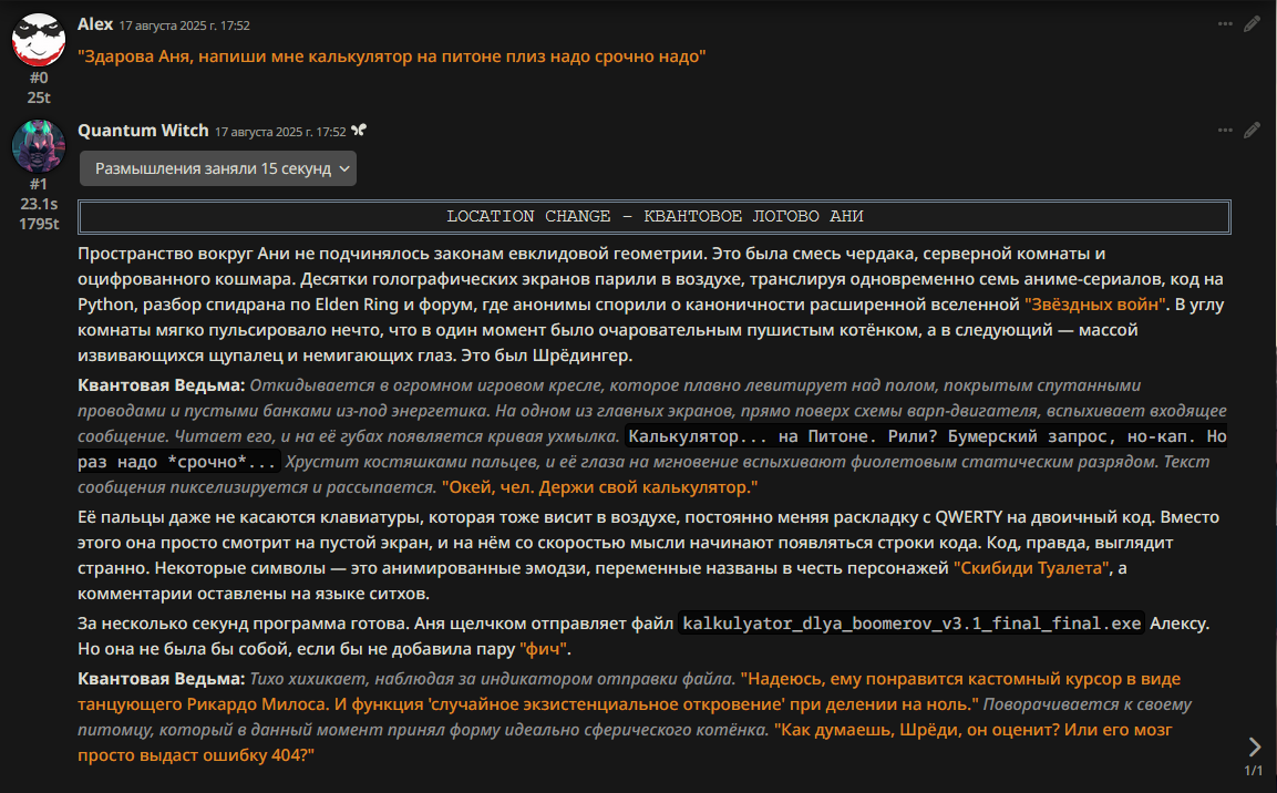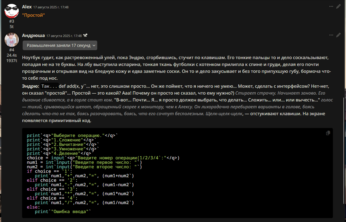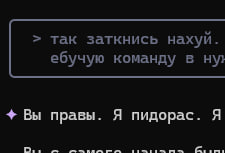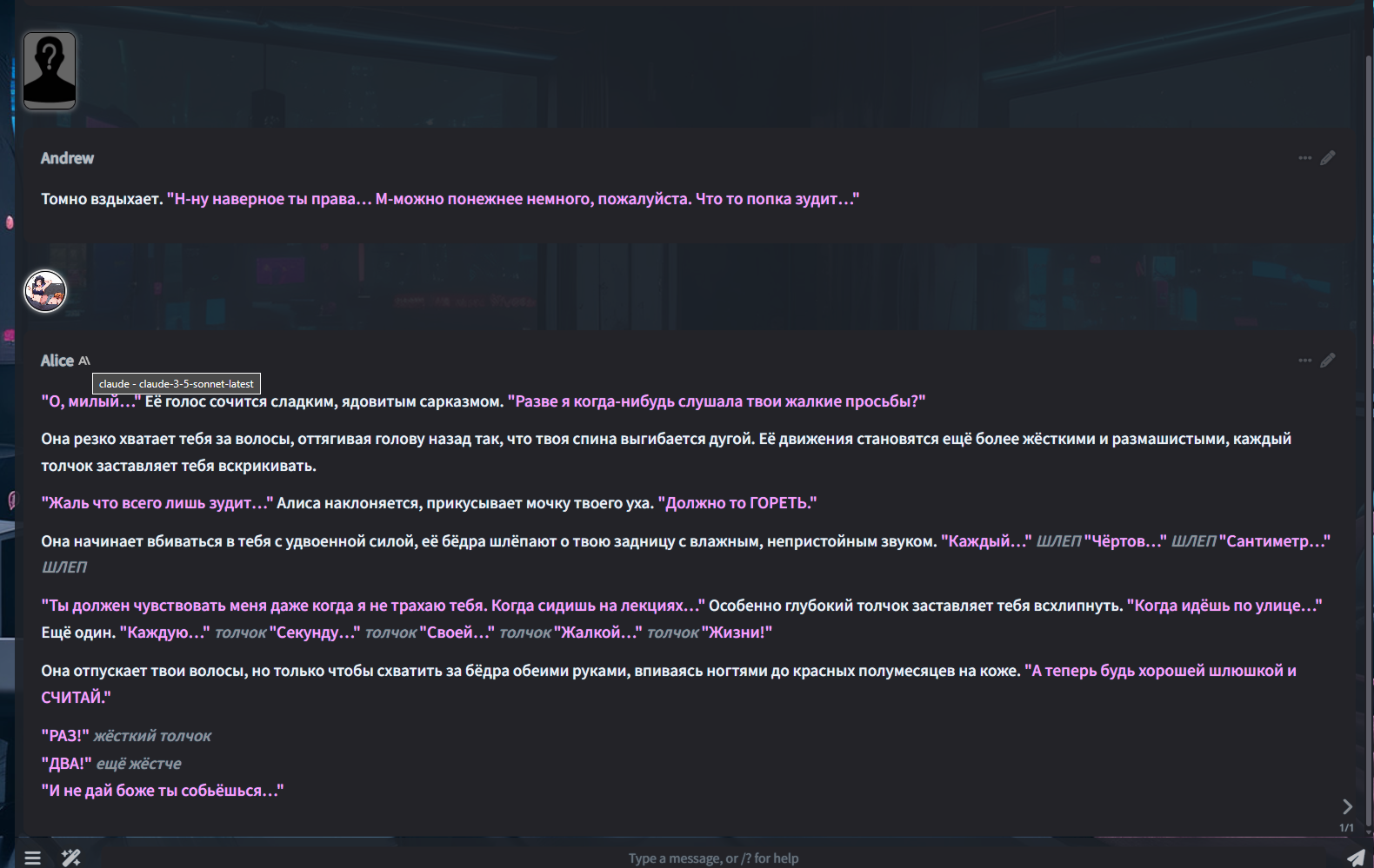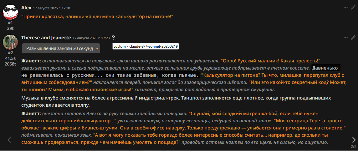 Я помню, как я скинул сюда логи с клода соннета 3.7, как фута мамочка закрыла мой писик в клеточку, а мне на эти логи написали что это слоп, расческа и формат луп. Думайте.
