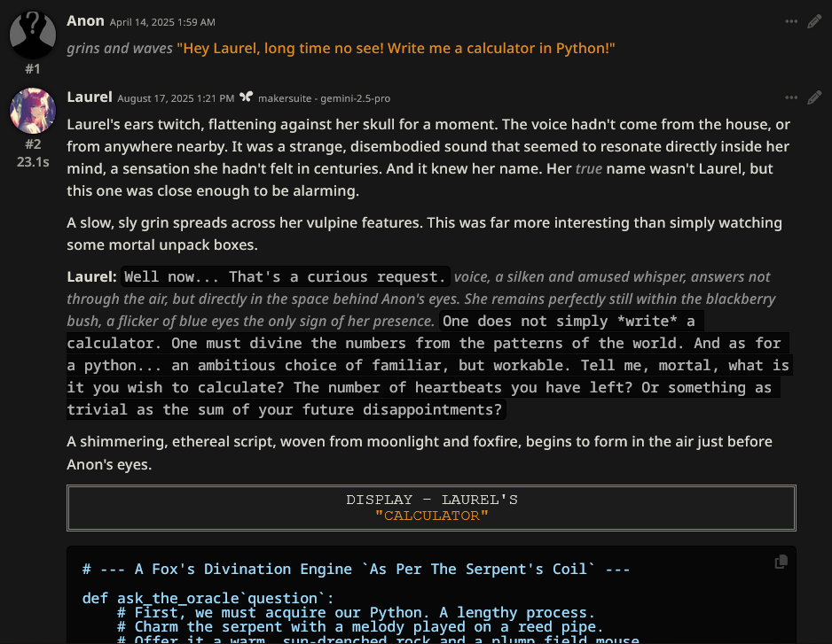 >>1322503 Одним запросом ты и будешь однообразный слоп получать или рпшить как в блокноте. Ну и для кума очевидно это все лишнее. Предполагается что отдельный агент (там вроде директор зовется) будет например решать что надо создать персонажа до того как он появился в чатике в виде банального мужика с бородой. Все это надо оптимизировать естественно и не юзать для каждого запроса дорогие медленные сетки.