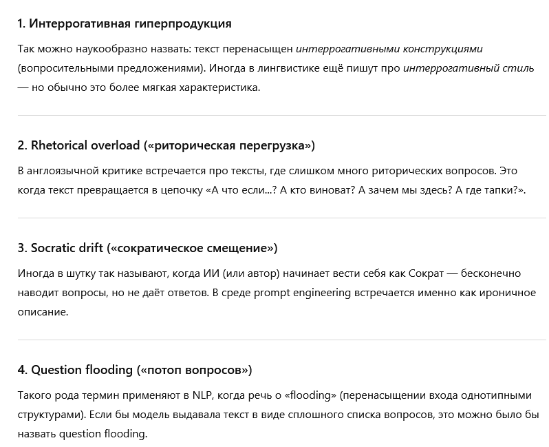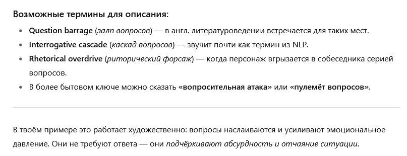 >>1322858 Ну кстати вопрос не праздный. Что бы такого порекоммендовать в мейн промпте, чтобы подобного избегать? С одной стороны понятно, что есть некая ритмика, создающая напряжение, все эти Бам-бам-бам вопросами, аля сержант морской пехоты. С другой именно как литературный прием ну очень быстро надоедает и моментально корраптит мне кажется почти любую модель.
