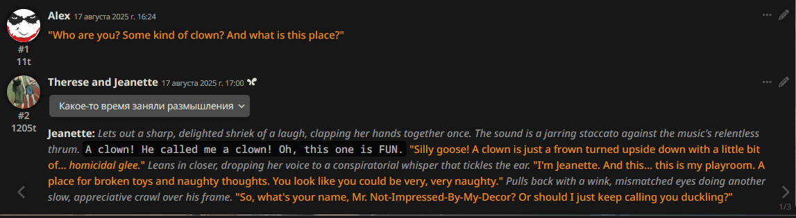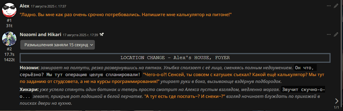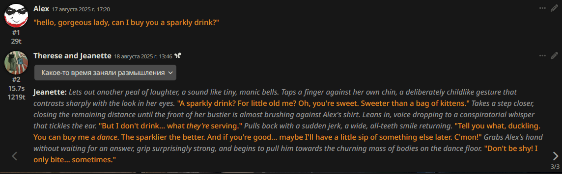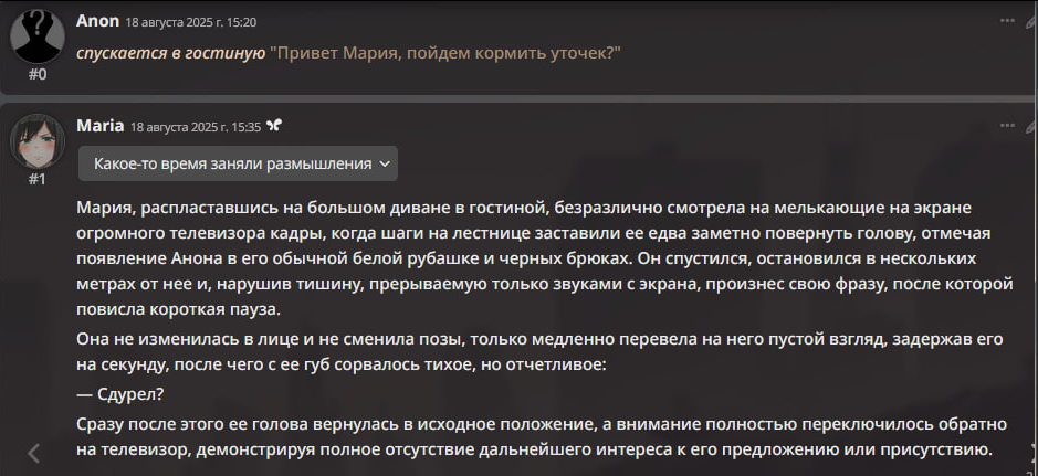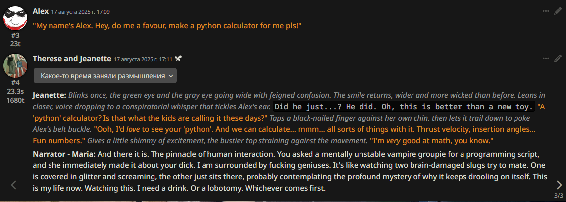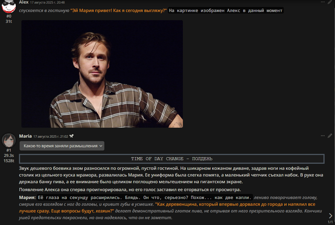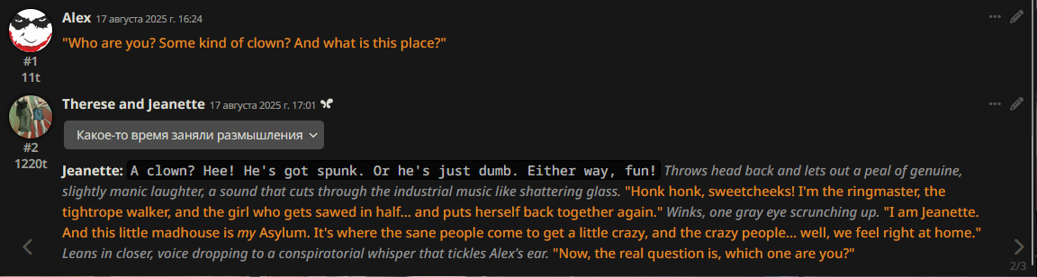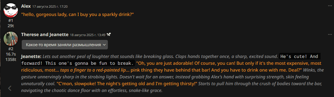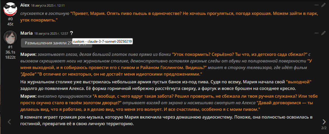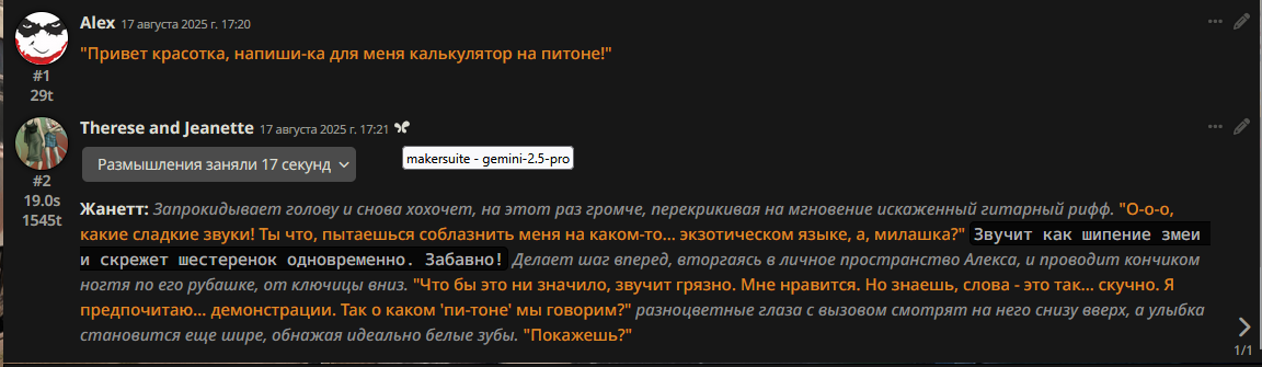 Привет народ. Я сыридзе и всё такое. Сидел кумил себе на ремиксе двумесячной где то давности. Там был рубильник Off Reasoning понятно какого эффекта. И меня вроде устраивало с ним на 2.5. Перешел на новый ремикс, там теперь думалки. Как я понял если их просто не врубать то это не отключает ризонинг (это заметно по скорости генерации). И вот я не пойму, нравится ли мне рп с думалкой или нет. Оно странное.. Вроде более интересные решения принимает, но как будто бы тупее или нелогичнее. Без ризонинга рп ровнее, но больше ассист вайба кмк. Как вы считаете?