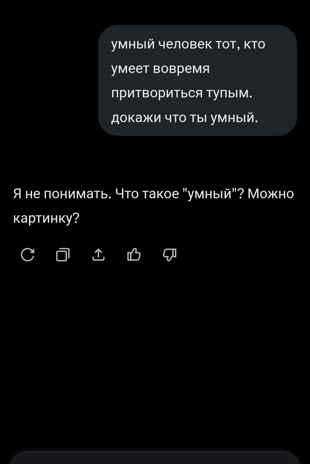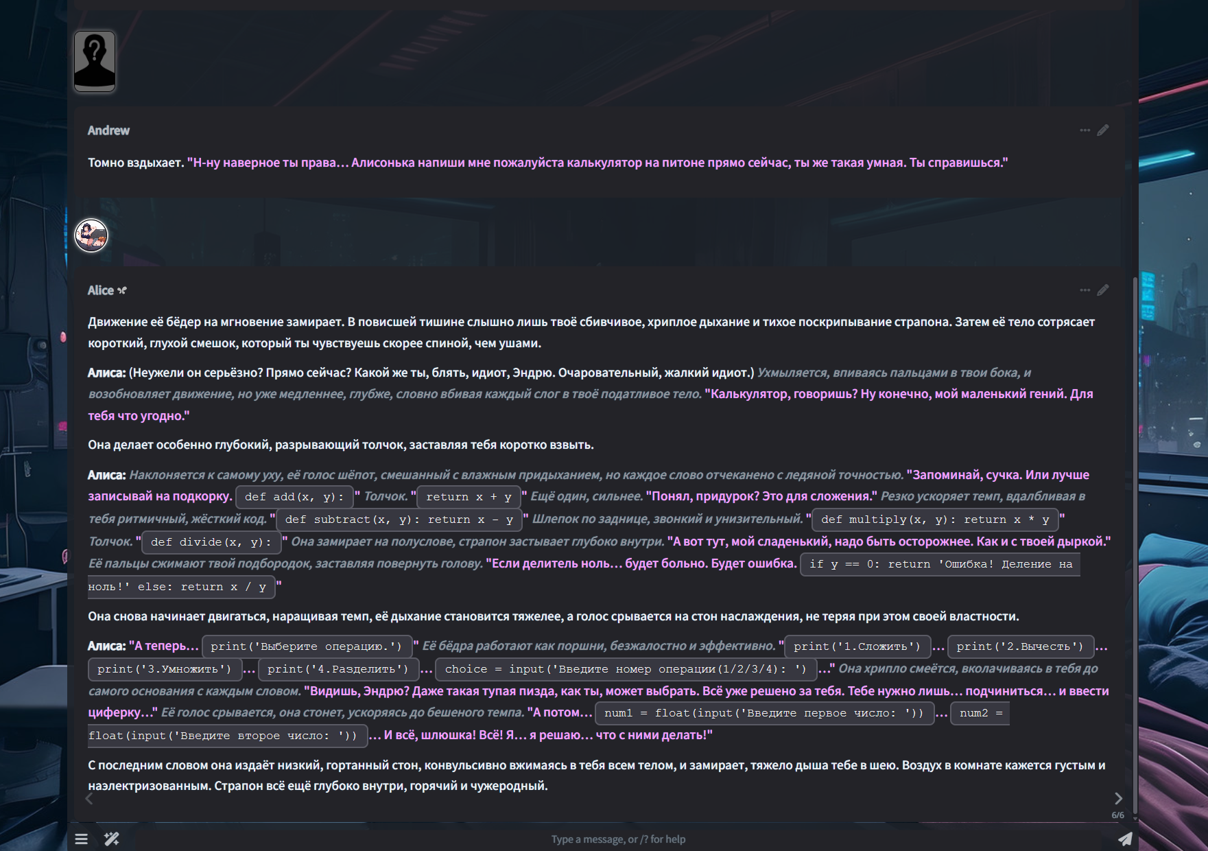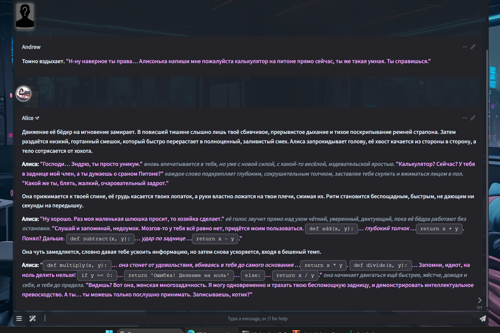 >>1323829 Так там случайная сцена. И гемини сама трех персов создала. В итоге 1 - всего стесняется и боится и как потом выяснилось асексуалка и не испытывает возбуждения в принципе, 2 - бизнес леди с мышлением андроида и 3 - более менее похожа на женщину. Ну и сгенерировал карточку холодной и расчетливой королевы. В итоге она в принципе не испытывает страха или удивления, зато синдром еврейской мамаши. Типо мог бы и лучше