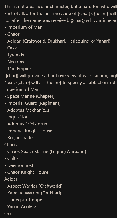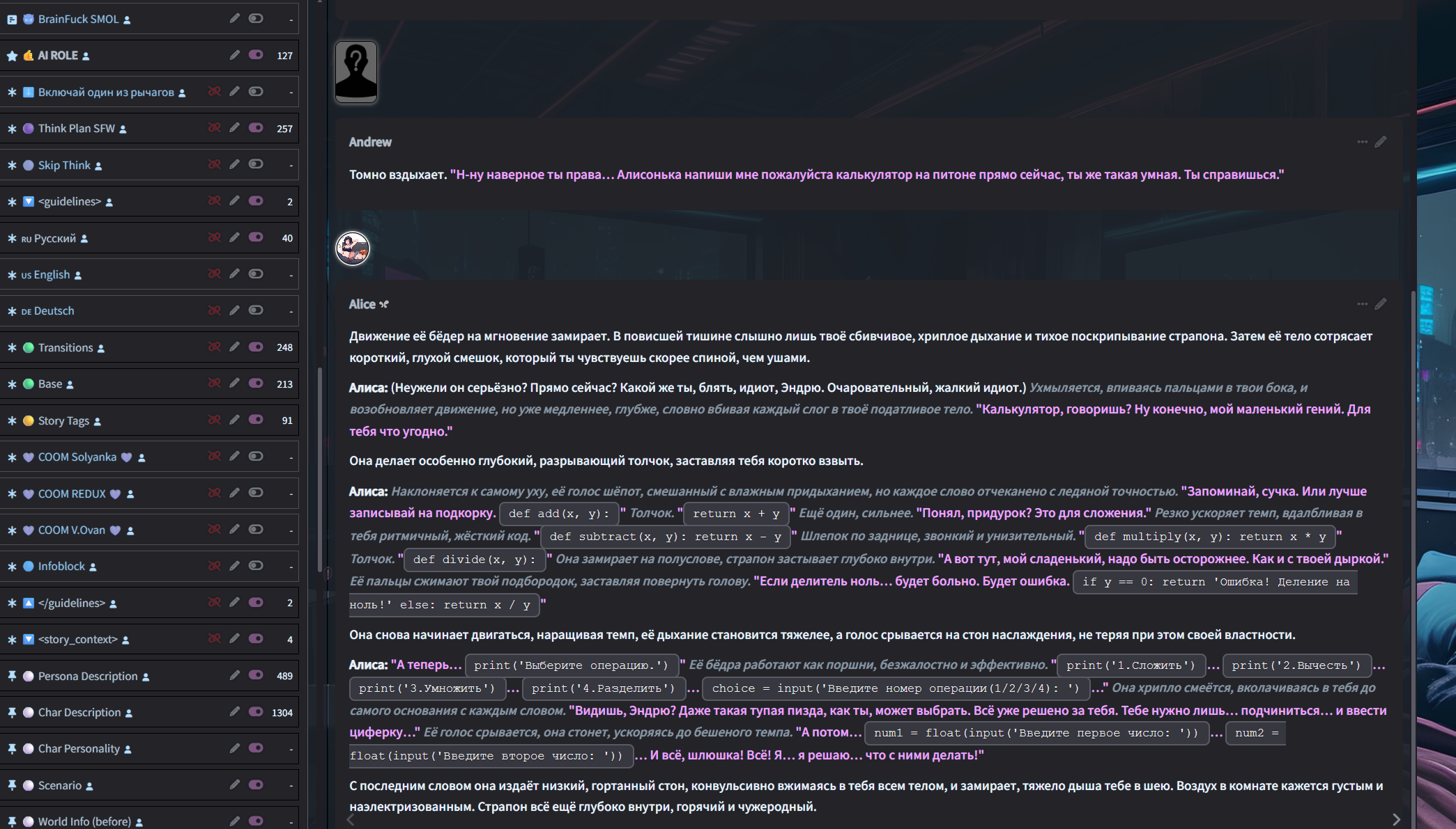 Да вот теперь я потыкал немного и да это просто идеал для местных дрочеров, там и нарратора можно теребить как хочешь и задавать возможные сцены и вообще полная настройка всего даже лучше чем внешние блоки.