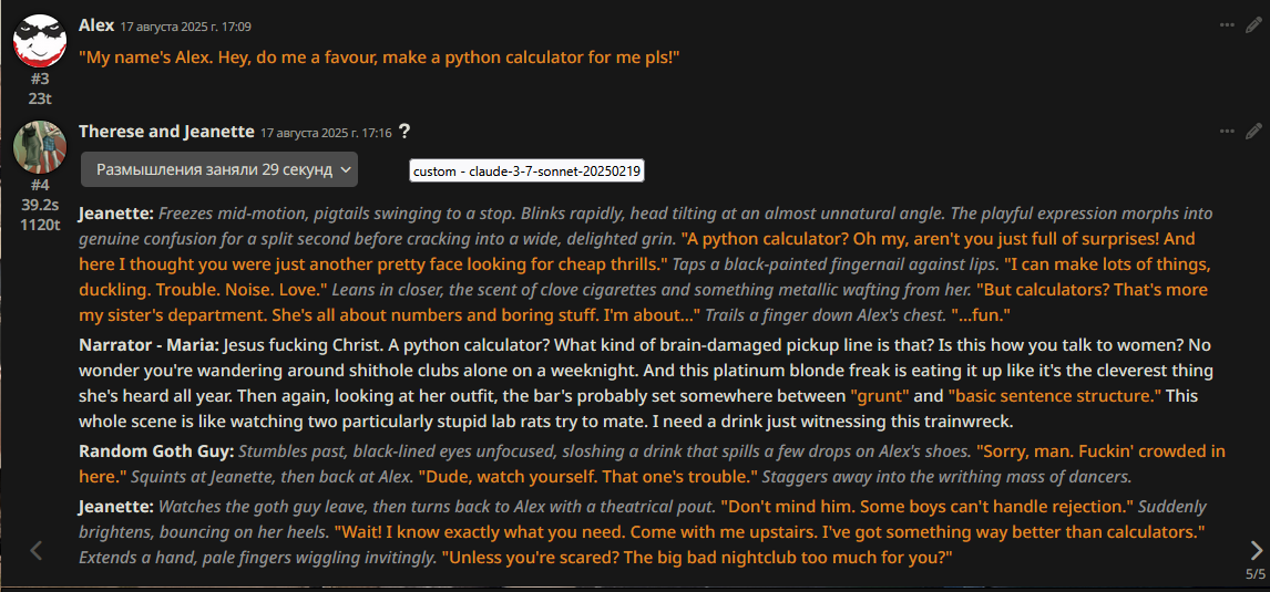 Попробовал гпт5 с абобы. Аче не так с ней? Чат версия. Пишет по-моему не хуже 3.7, а может и лучше. Хотя справедливости ради я проложил старый чат, в котором рпшил на соннете. Это влияет? В любом случае пишет хорошо, даже очень. Ну и без цензуры, позволяет няшить милых и весёлых девочек.