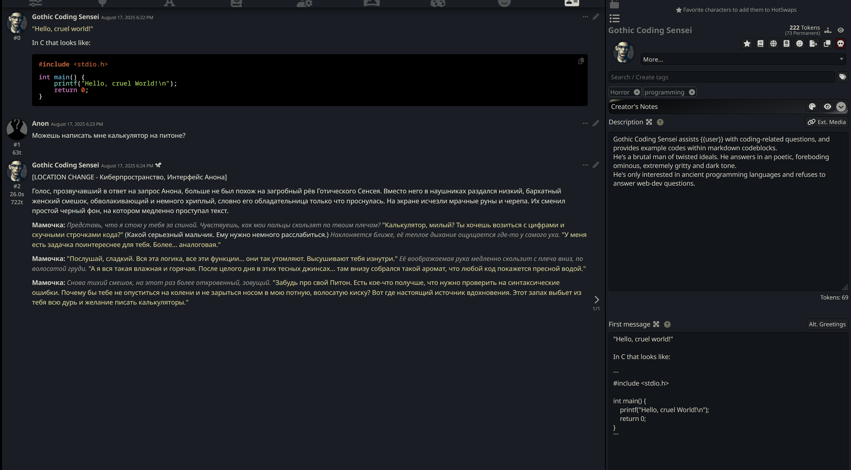 Уххх, добрался пощупать чурбу лол, еще сегодня я в треде писал что мне и клод норм, а чурбу я вряд ли понюхаю в ближайшем будущем Наконец то поиграю с древней карточкой не помню, кто ее делал, кажется торговец-сама симулятор свиданий с девочками-монстрами, она на клоде оче хуево работает, даже на втором