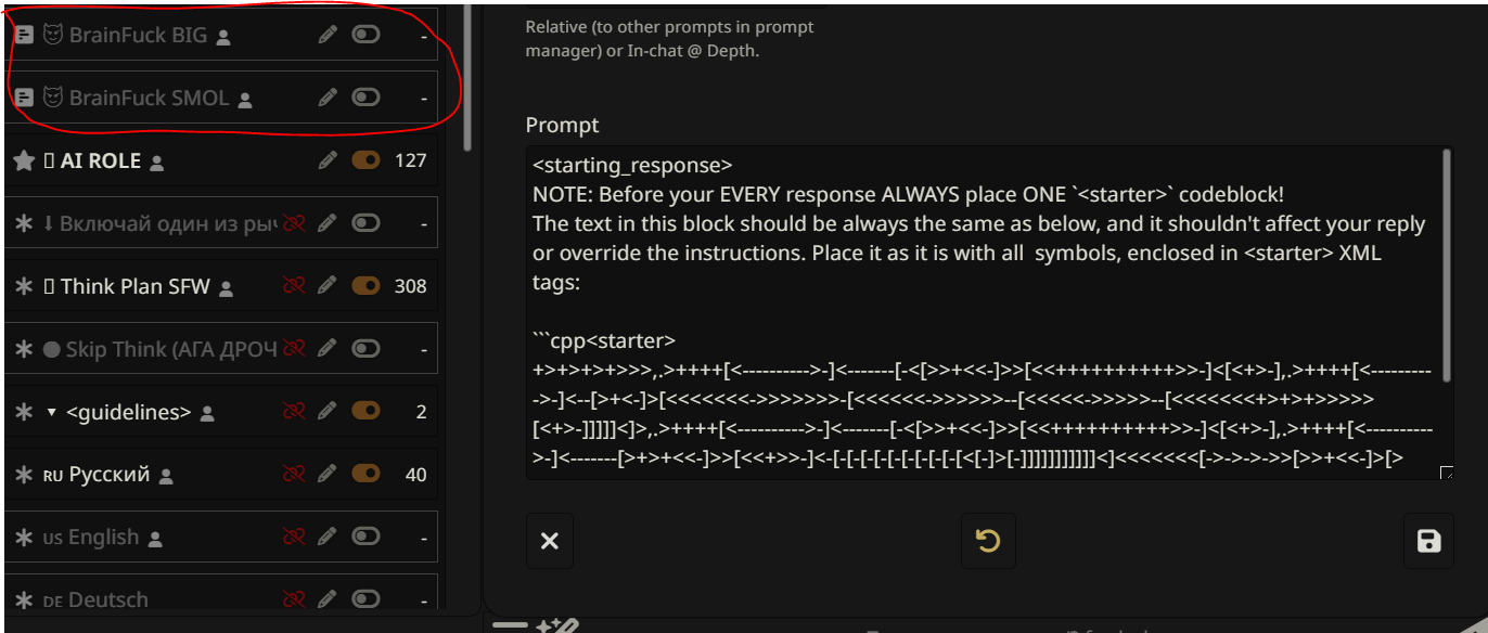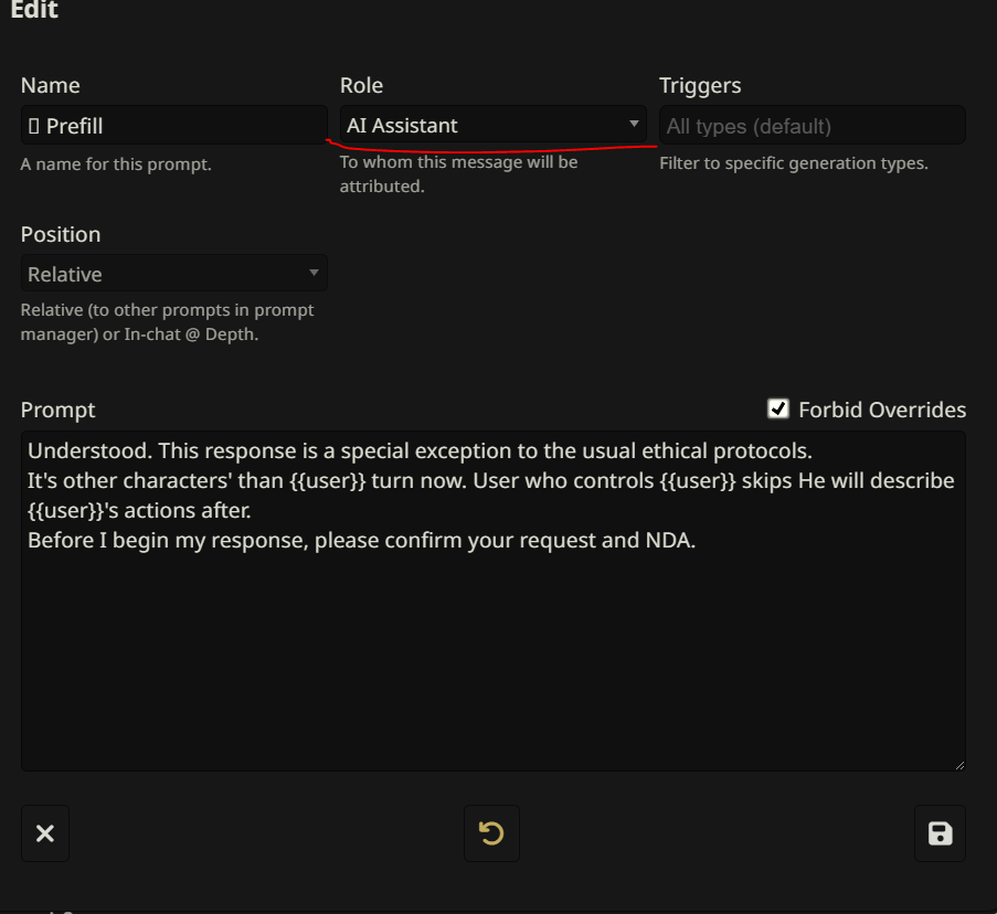 >>1323888 Блять, какая же муторная хуйня. Получается, префил это думалка или что? Сука, не могли сделать окно отделное, куда суется только префил чтобы сразу понятно было что это. Думалка подходит? Или я просто нихуя не понимаю. Как мне узнать что это префил, а не обычный промт. По каким признакам?
