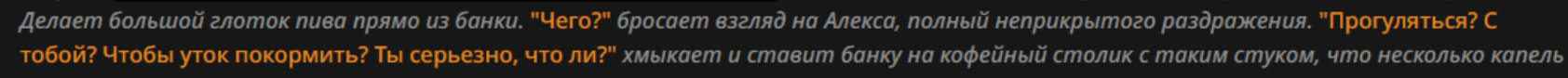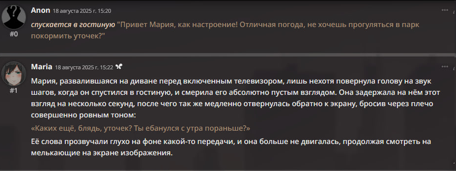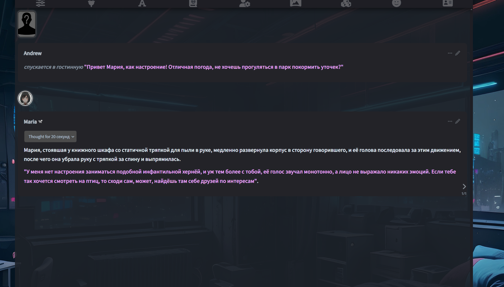 Кому нибудь удалось добиться на гемини живых персонажей? А то если персонаж прописан как холодный, то гемини решает, что это андроид человекоподобный. Например, недавно описывая бизнес леди мне гемини заявила от ее лица. Мое тело система и т.п. Более того такой персонаж еще и нияего не будет бояться и ничем его не удивить. Хоть там чудовище из Лавкрафта прийдет. Реакция будет - и это все? Мог бы и лучше