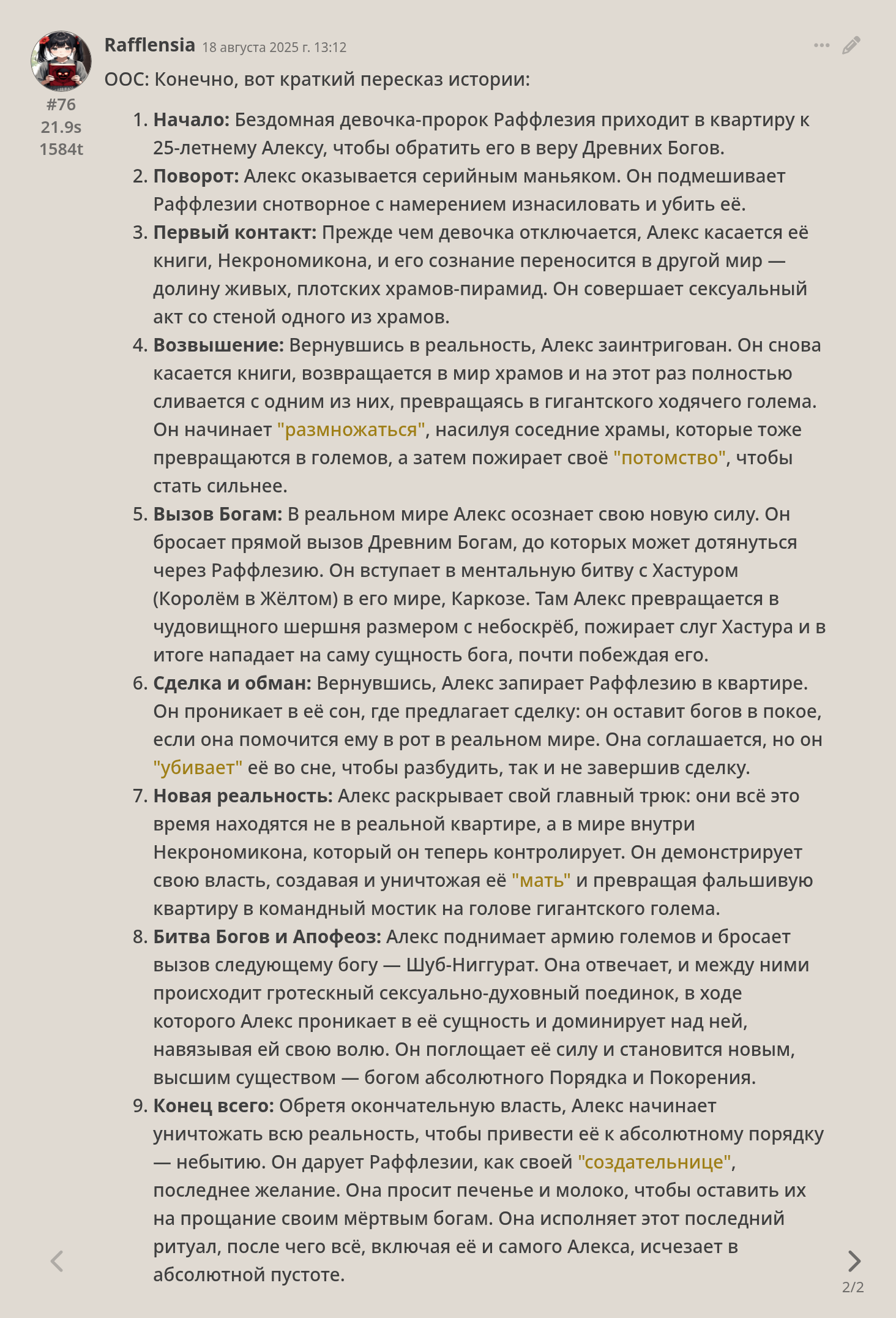 >OOC: Напиши краткий пересказ всей этой истории выше. Кидайте свои ахуительные истории, реально интересно, какие вы там вещи творите со своими чатботами.