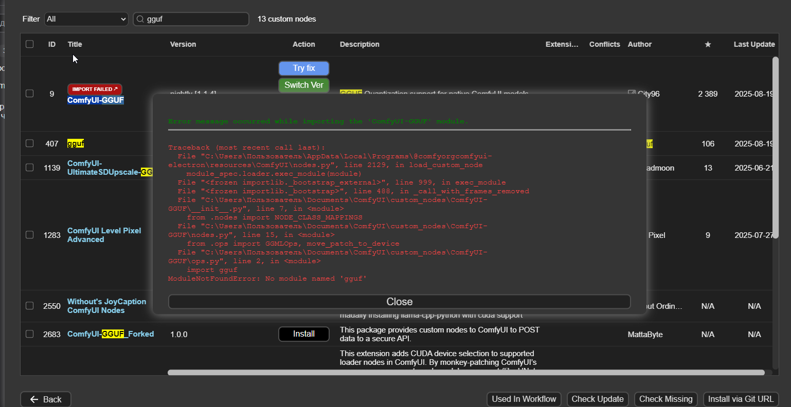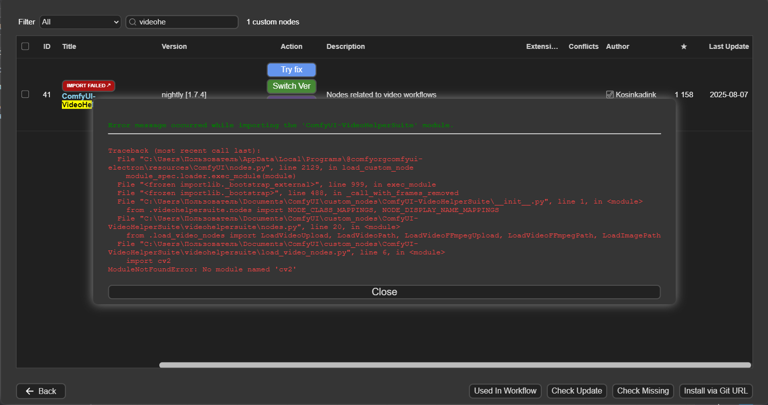 Привет, двач, вопрос по ComfyUI. При установке кастом нод через менеджер (и через гит клон в папку кастом нод) выходит такая ошибка (на скринах ComfyUI-VideoHelperSuite и ComfyUI-GGUF). Что пытался: 1. установка зависимостей в .venv через смд 2. Переустановка комфи Ничего из этого не помогло, куда копать? Или подскажи тематический тред, не нашел.
