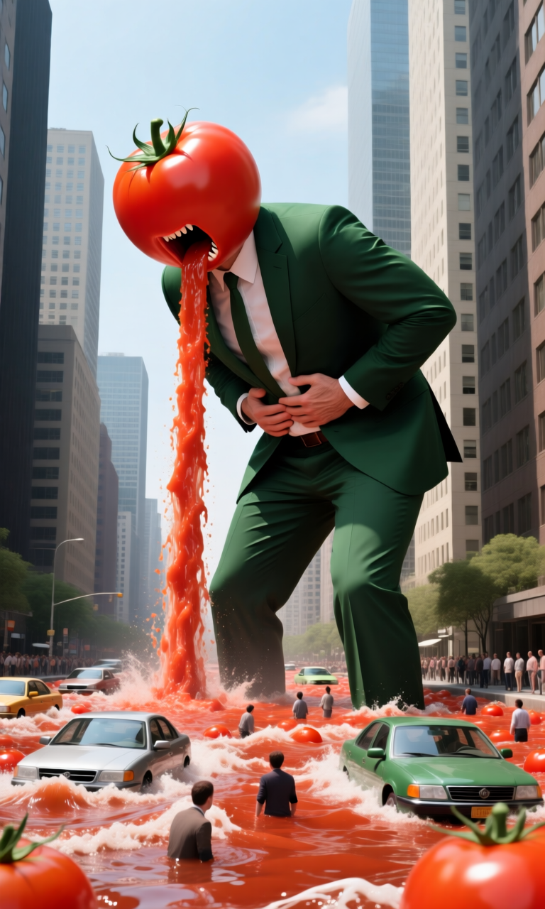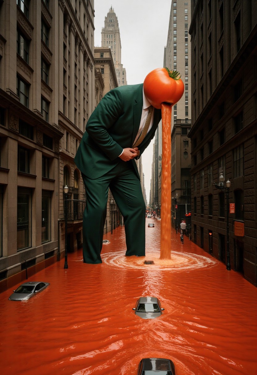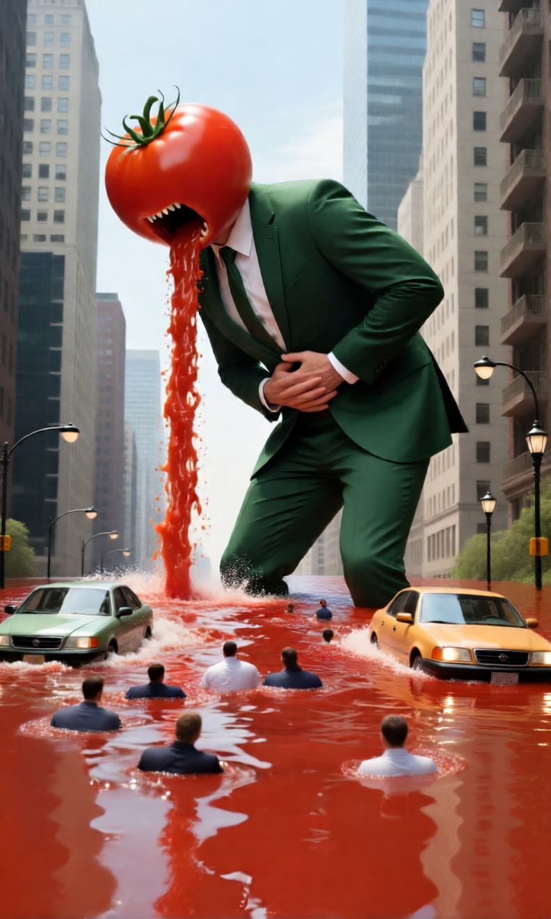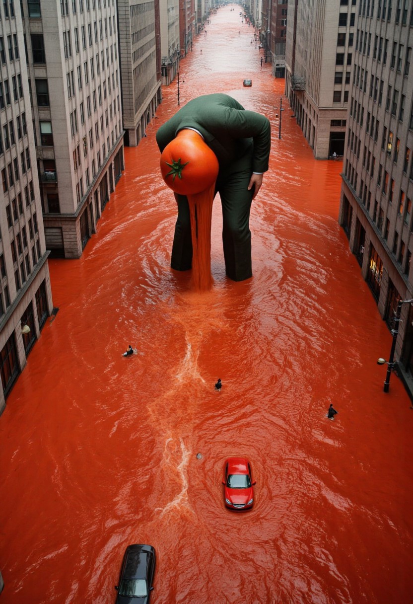 >>1329922 >Giant man wearing dark green business suit with big tomato instead his head standing waist deep in the tomato juice river, surrounded by high buildings. He is on the back plane and 100 meters tall. Space between buildings is narrow. All space below is totally filled with tomato juice and the level of liquid is up to giant`s knees and 2nd floors of buildings. > >Giant hangs his tomato-head and bends down, he is holding his stomach and bending over in pain, he open his mouth and vomits with a thick waterfall of tomato paste and juice down. Flood with waves carries cars and people towards camera. Cars and people floating in the river of tomato liquid. > >only tops of streetlights seen over the surface of red river. > >surreal photo, daylight, high resolution,