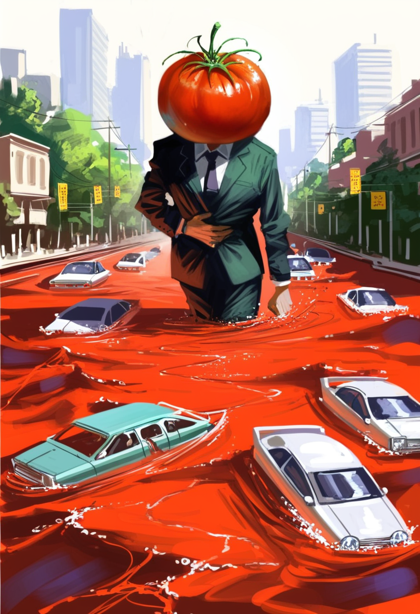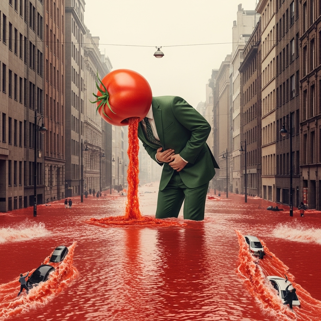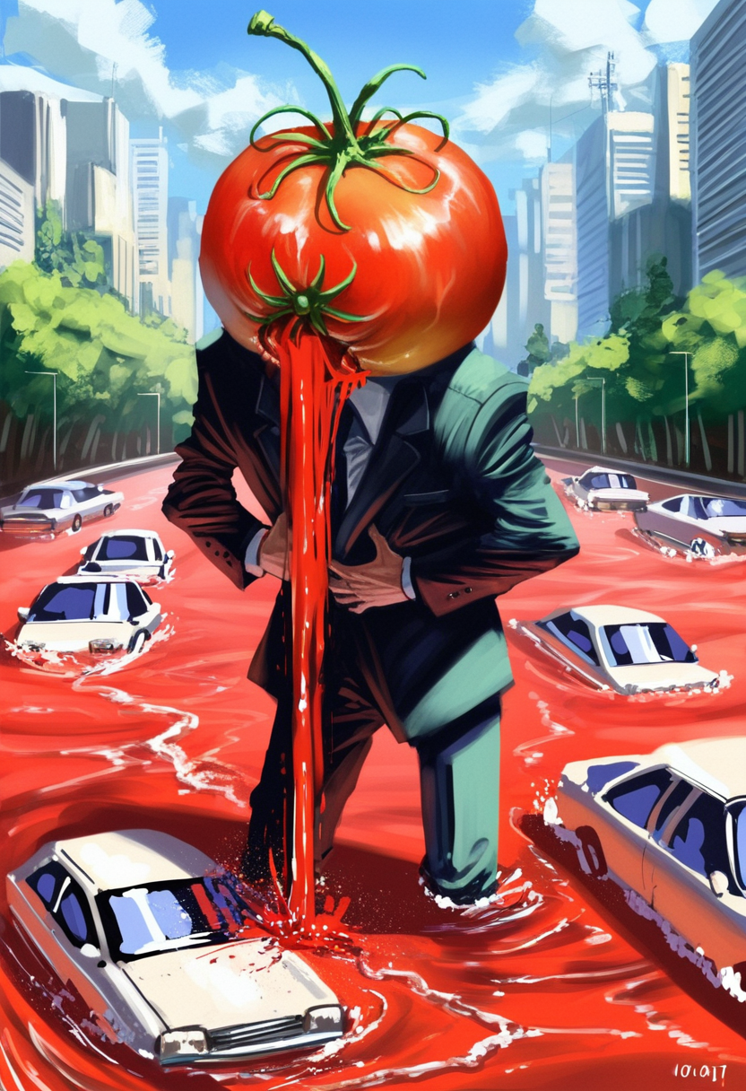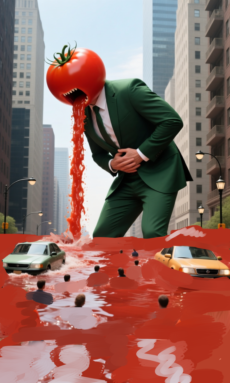 >>1329922 >Giant man wearing dark green business suit with big tomato instead his head standing waist deep in the tomato juice river, surrounded by high buildings. He is on the back plane and 100 meters tall. Space between buildings is narrow. All space below is totally filled with tomato juice and the level of liquid is up to giant`s knees and 2nd floors of buildings. > >Giant hangs his tomato-head and bends down, he is holding his stomach and bending over in pain, he open his mouth and vomits with a thick waterfall of tomato paste and juice down. Flood with waves carries cars and people towards camera. Cars and people floating in the river of tomato liquid. > >only tops of streetlights seen over the surface of red river. > >surreal photo, daylight, high resolution,