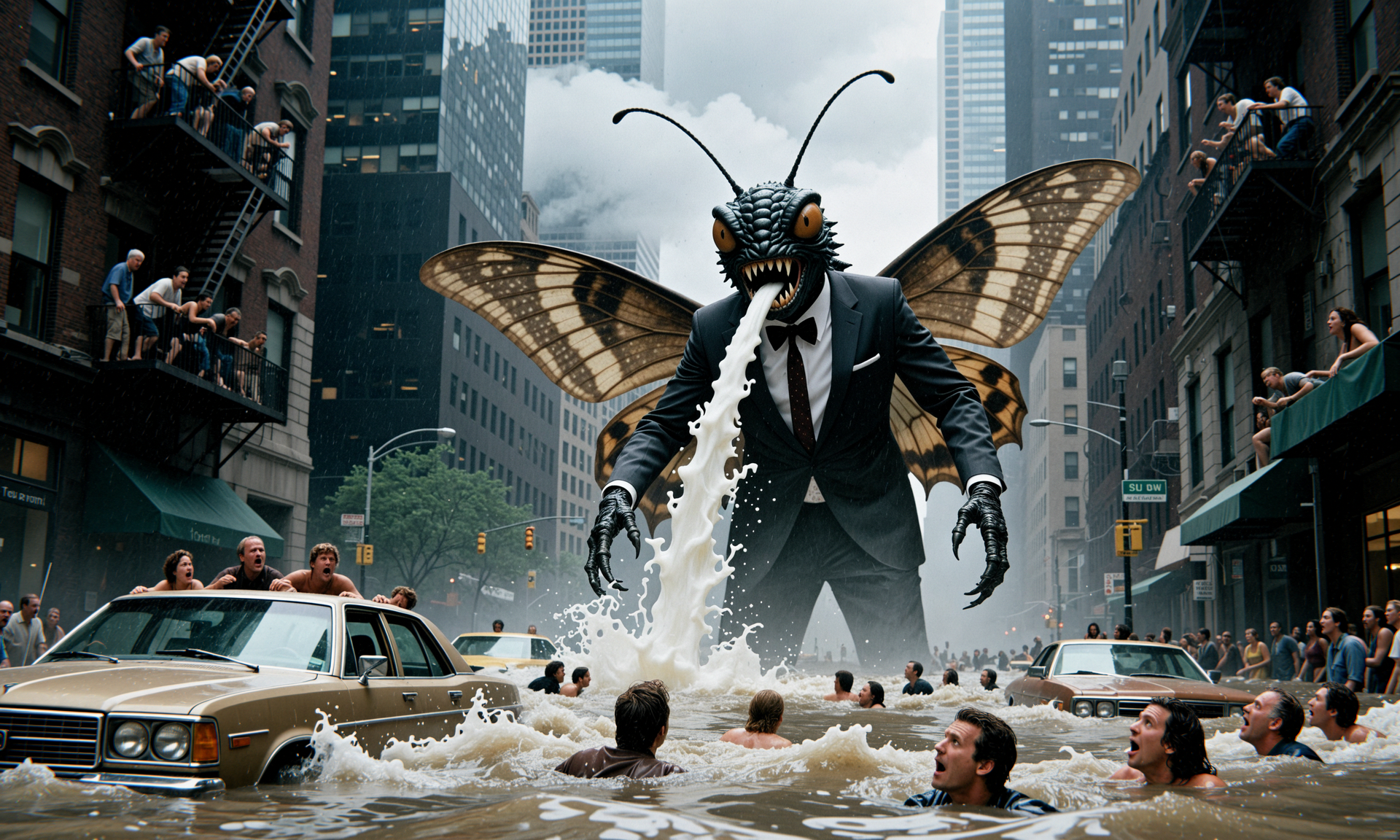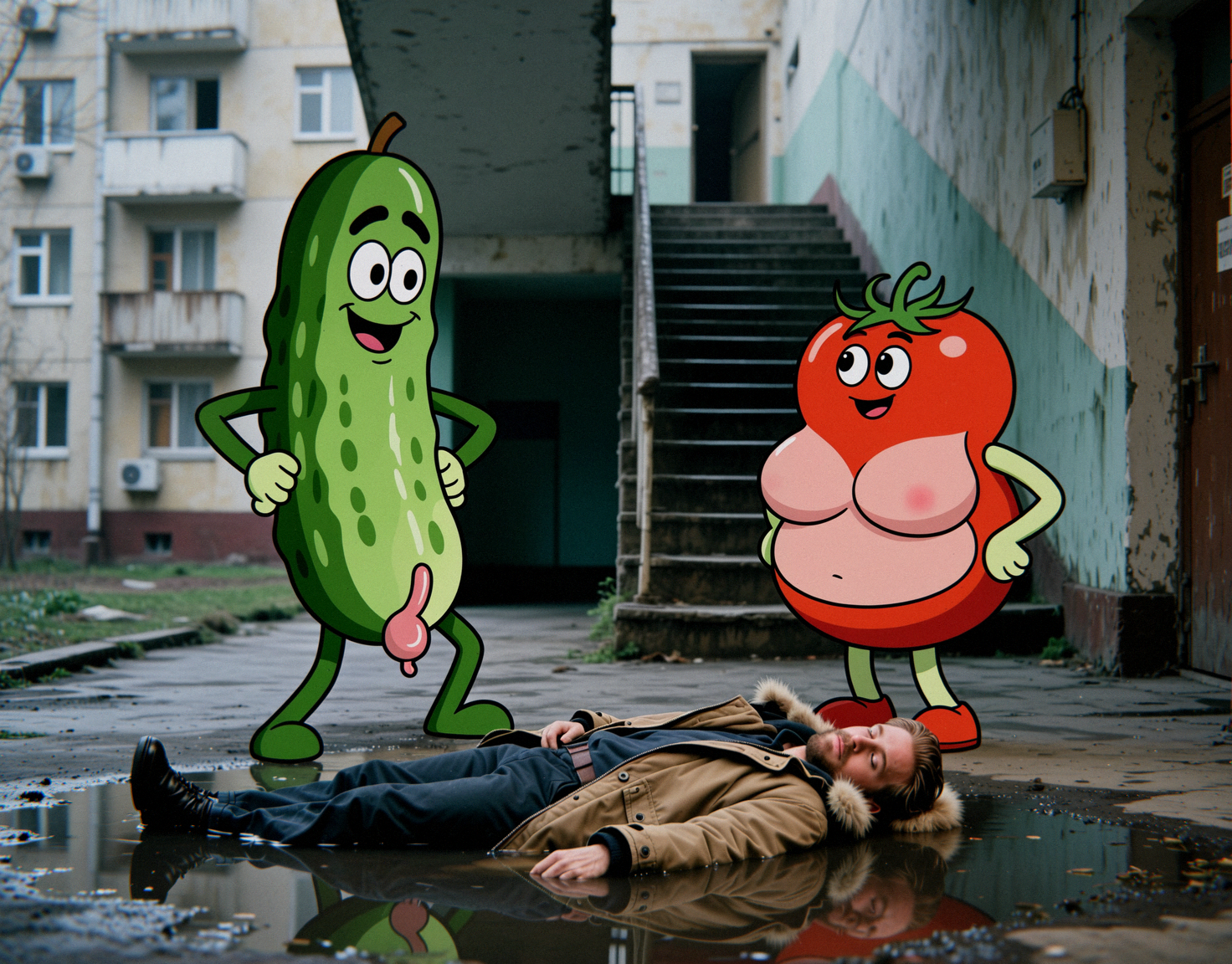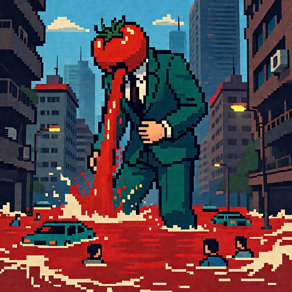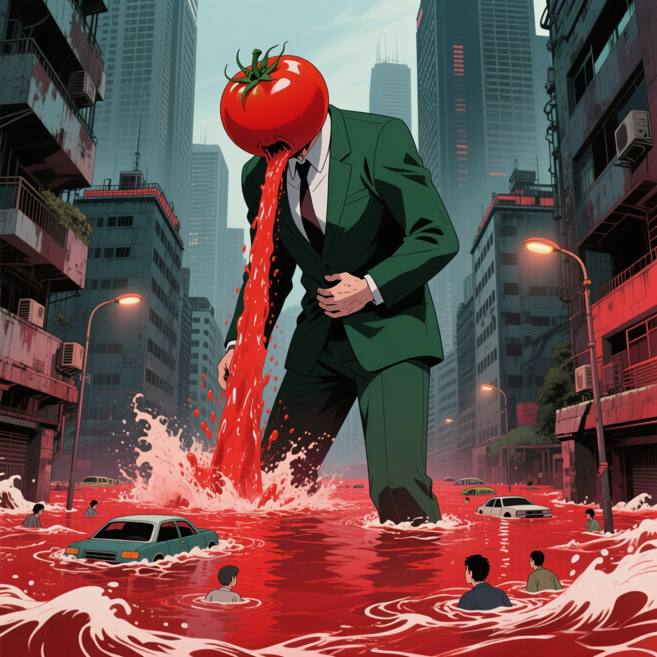 >>1329922 >Giant man wearing dark green business suit with big tomato instead his head standing waist deep in the tomato juice river, surrounded by high buildings. He is on the back plane and 100 meters tall. Space between buildings is narrow. All space below is totally filled with tomato juice and the level of liquid is up to giant`s knees and 2nd floors of buildings. > >Giant hangs his tomato-head and bends down, he is holding his stomach and bending over in pain, he open his mouth and vomits with a thick waterfall of tomato paste and juice down. Flood with waves carries cars and people towards camera. Cars and people floating in the river of tomato liquid. > >only tops of streetlights seen over the surface of red river. > >surreal photo, daylight, high resolution,