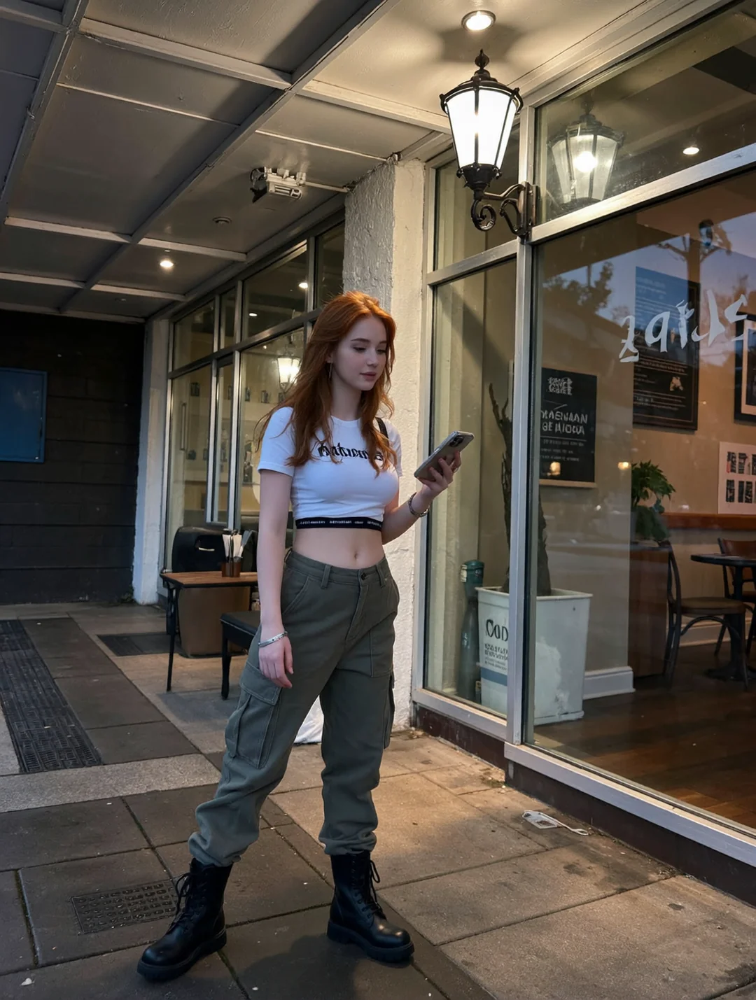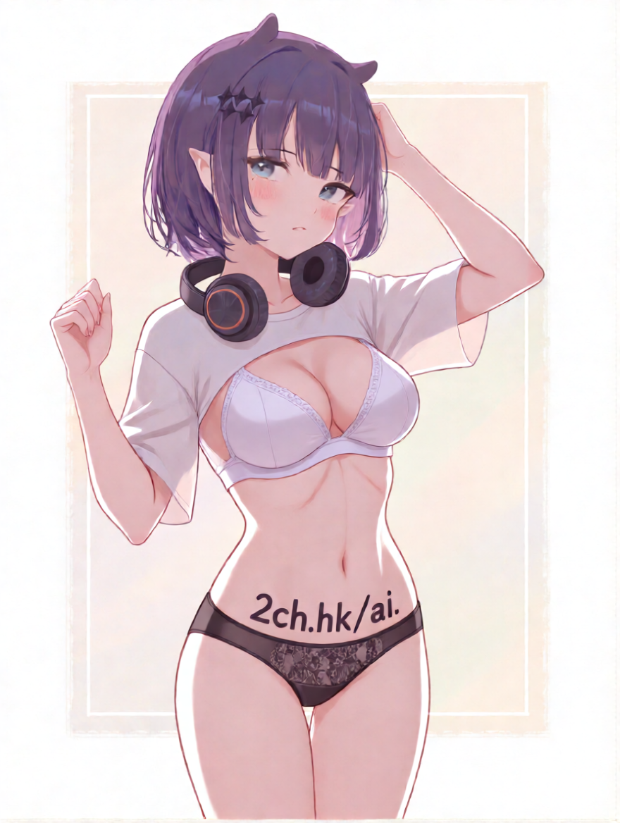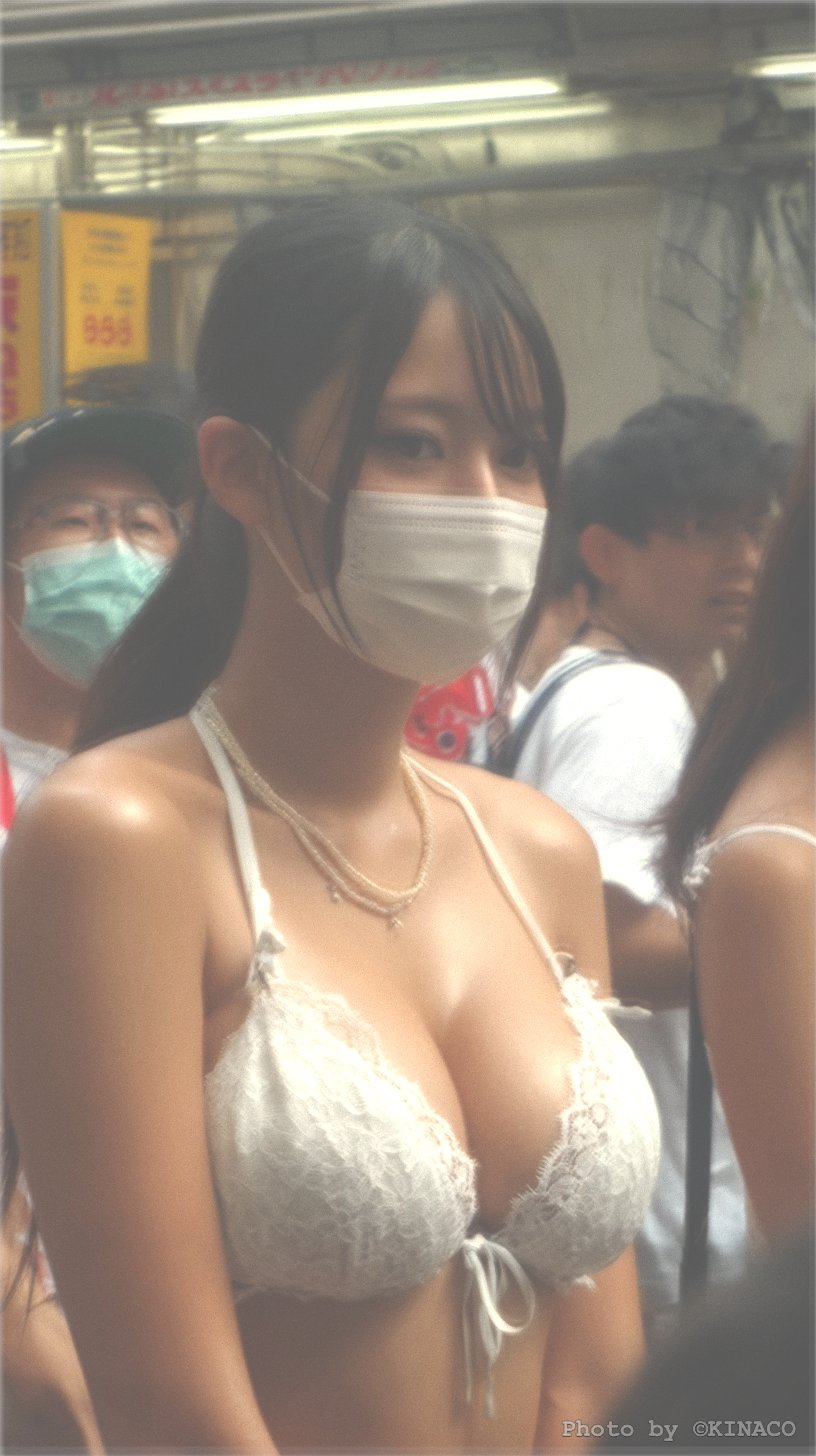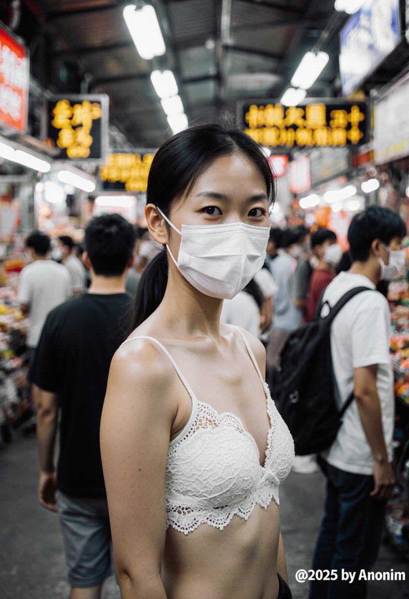 >>1330673 >>4 Это Флюкс Кри. Хорошая фотореалистичная модель (после Ван, конечно - он на остальных пикчах). Промпт с и2т: The image is a photograph taken in an urban setting, likely in a crowded market or shopping area. The central figure is an Asian woman with dark hair tied back in a low ponytail, wearing a white lace bralette that reveals her medium-sized breasts and is accented by thin white straps. She has light to medium skin tone and is wearing a white face mask. The woman stands slightly to the left of center in the frame, facing forward with her body turned slightly to the right.