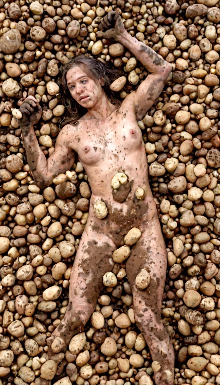Giant hangs his tomato-head and bends down, he is holding his stomach and bending over in pain, he open his mouth and vomits with a thick waterfall of tomato paste and juice down. Flood with waves carries cars and people towards camera. Cars and people floating in the river of tomato liquid.