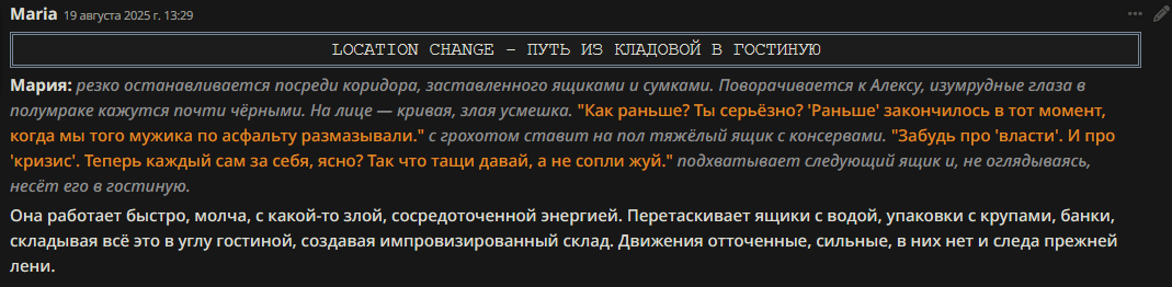 >>1325555 просто в карточке марии в сценарий добавил <scenario> Year 2025, October. Zombie outbreak starts. Starts like a new strain of COVID-19, but quickly will escalate. News on TV say not to panic, wear masks and stay home. Hospitals are full, infected people die of fever and pneumonia and then rise. The authorities are hiding the scale of what is happening so as not to cause panic </scenario>