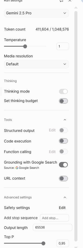 Ребят, может объяснить. В ai studio gemini pro 2.5 обрезанный какой-то? Просто в тестах многих он умнее чата джпт5 даже финкиг, а на деле даже o3 умнее его. Он на уровне джпт 4o будто. Или в бесплатной версии там старая какая-то? А как получить умную? Кроме апи покупки. Так же вопрос, помогите разобраться с этими настройками, если бюджет на раздумывания оставлять автоматическим как он дает ответы? Из размера вопроса? Тоже непонятно выставляю вручную максимум ответ такой же как и если бы выставлял автоматически. И другие настройки, как ими пользоваться?