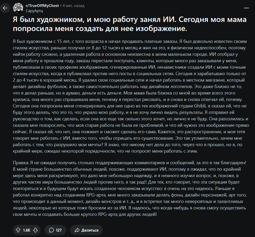 Нет, я не рисую для себя. Я рисовал для детской литературы и рекламы, для коммерции. Пошёл на повышение. Ща в основном рисую правки и черновики. А финальный графоний вообще в 3д делаю, без нейронок (если не учитывать денойзер).