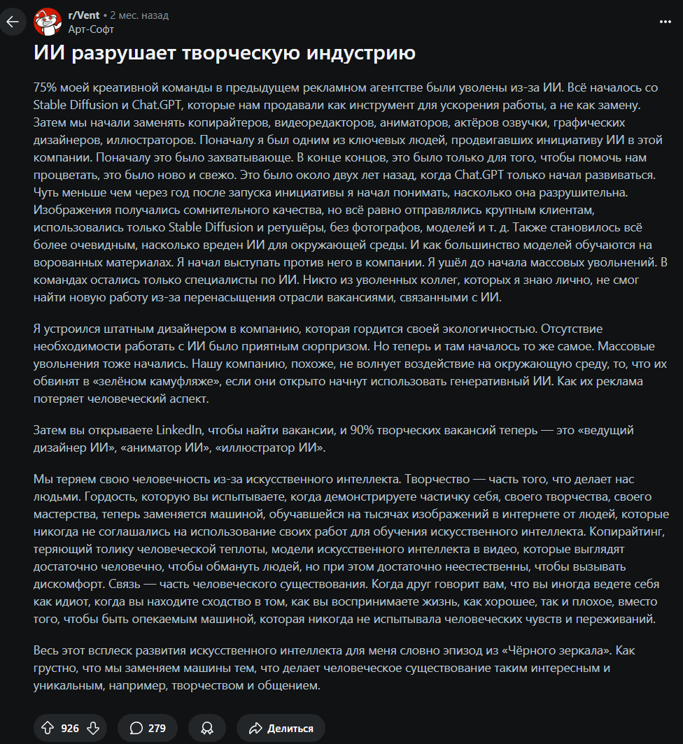 Я не луддит, не отрицатель. Я радуюсь охуенному скачку в мире производства лекарств, в мире компьютерного зрения. Да и тачки с автопилотом заебись (хотя до сих пол работают только в ясную погоду днём и стоят дороже мясного водителя)