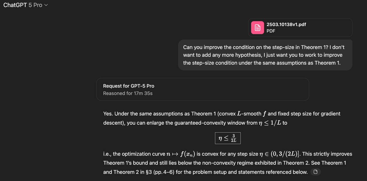 GPT-5-Pro рассуждал всего 17 (!) минут и впервые в истории улучшил известную границу с 1/L до 1,5/L (+ люди довели результат до 1.75/L). Это было абсолютно новое открытие, которого никогда не было в интернете или исследованиях.