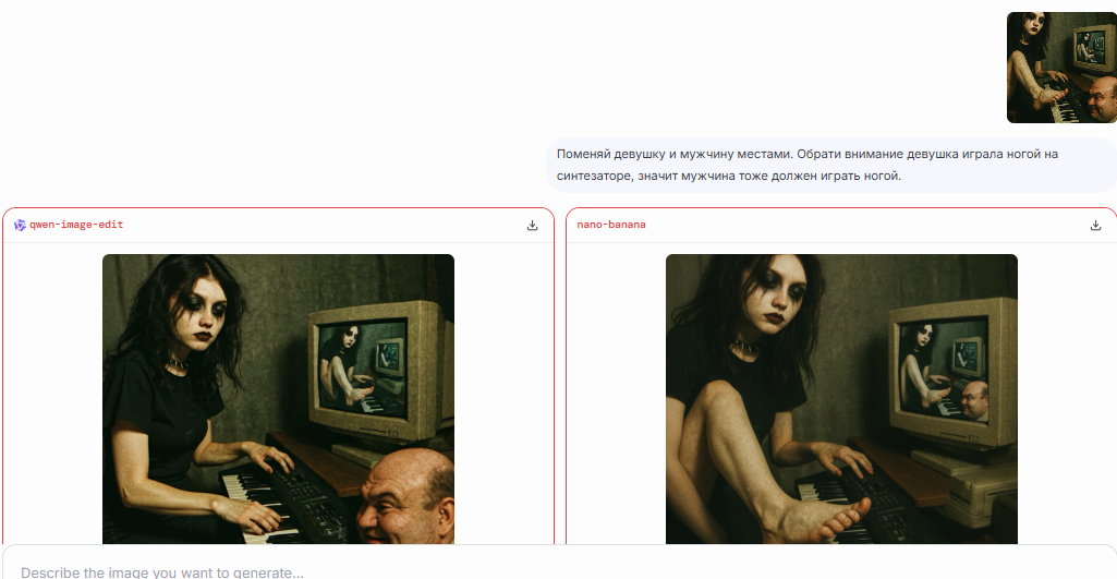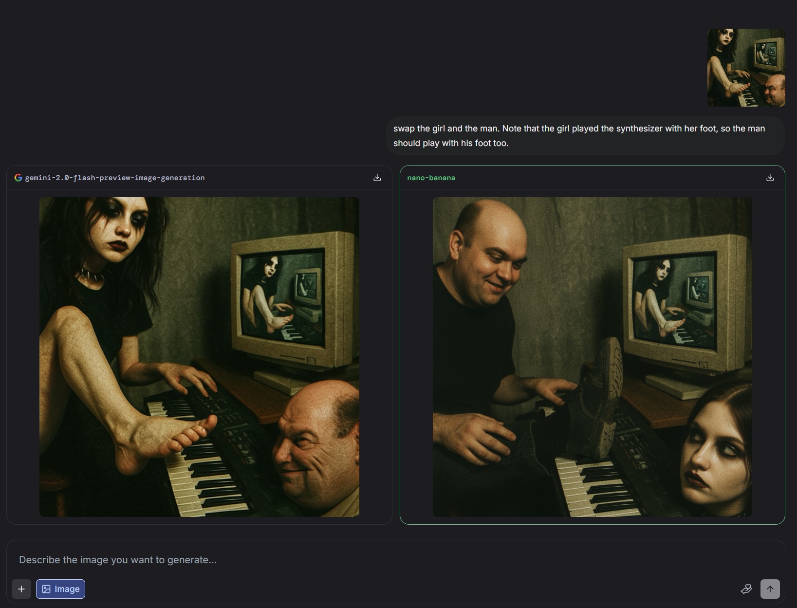 >>1326511 >Напомню: это лучшая модель Лучшая среди худших. Кстати, гемини-флеш картинко едит на самом деле очень недурственно генерит, проблема только в том, что она тренирована на очке шакала и поэтому там мутации сплошные. Зато не так давно, она единственная из крупнокорпоративных могла реально черты лица передать с примера. почти их не всирая. Многие ведь, как дерьмина, просто фесвап в комбайн вкручивают.
