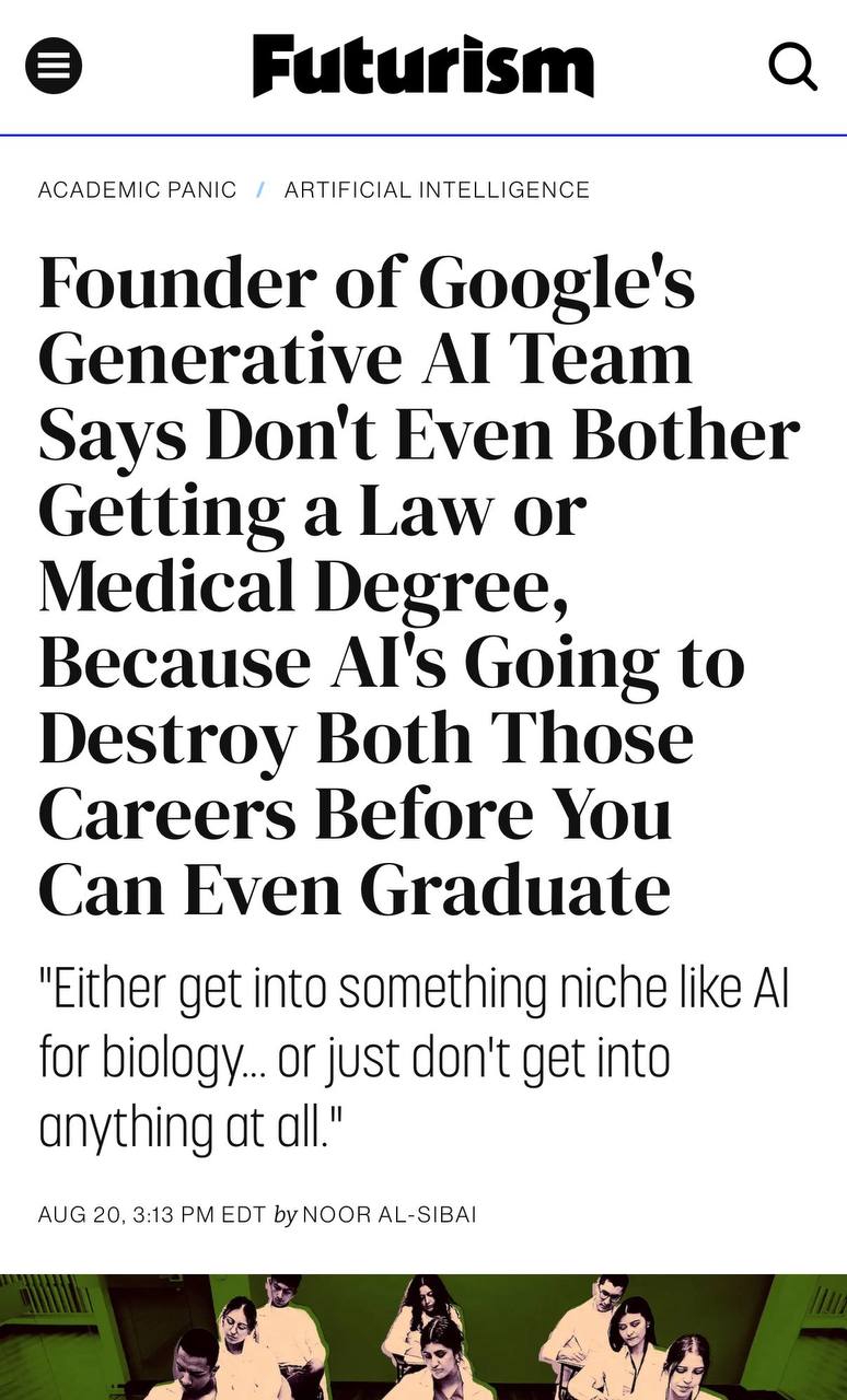 «Мы точно знаем, что грядут огромные перемены», сопоставимые с промышленной революцией, но сжатые в «более короткий период времени, и они могут быть даже более масштабными». Он прогнозирует, что в течение следующего десятилетия генеративные инструменты будут действовать как «невероятные усилители производительности», давая работникам почти «сверхчеловеческие» способности.
