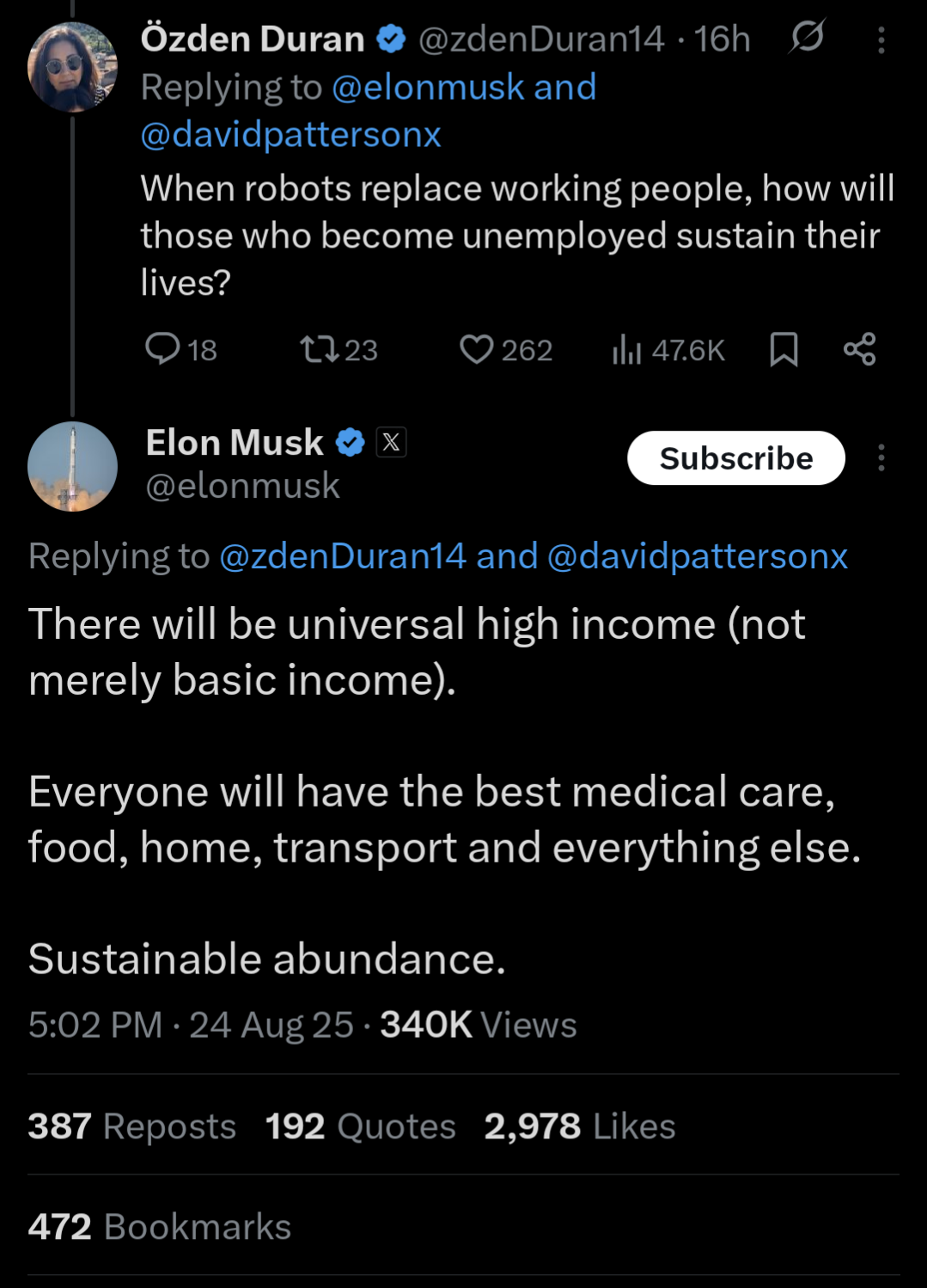 Елон Маск сообщает - когда Грок допилят, у всех будет универсальный высокий доход (не базовый доход). У всех будет хорошая медицина, еда, дома, транспорт и все остальное. Будет устойчивое изобилие.