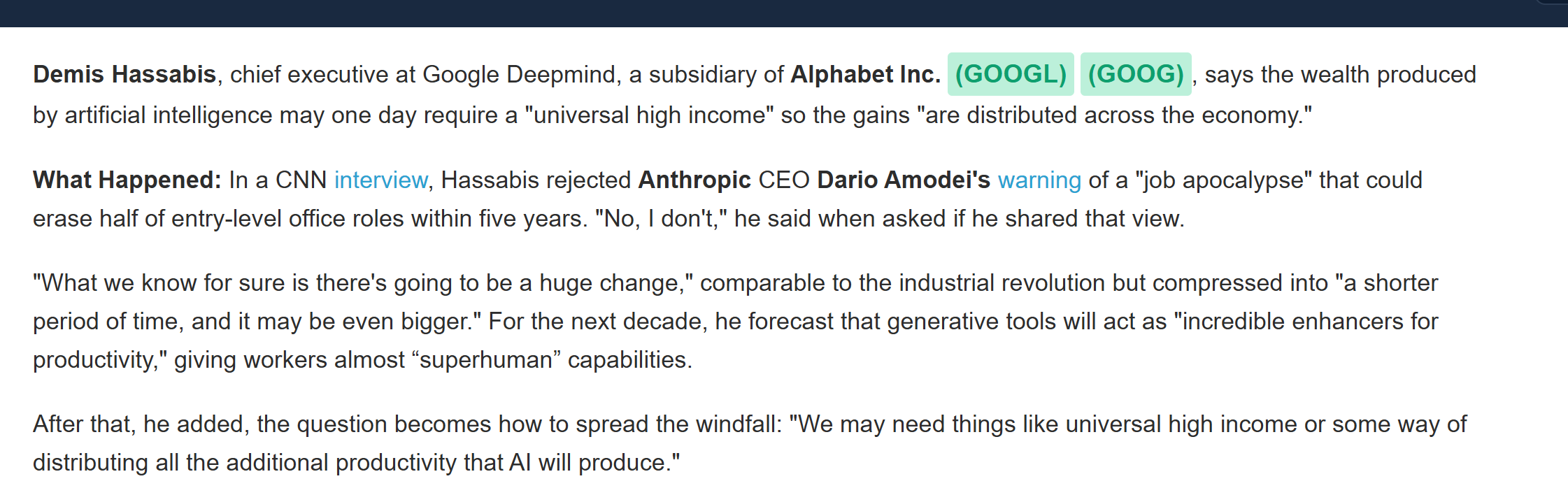 >>1331989 Демис Саххабис, главный инженер Гугл Дипмайнд, поддержал Маска и сообщил, что будет универсальный высокий доход.