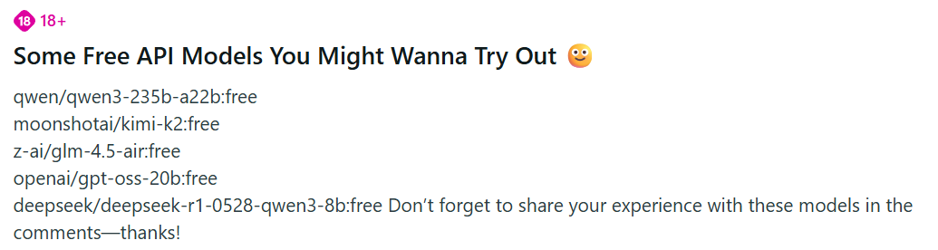 У всех в силли таверн через опенроутер deepseek v3 бесплатный выдаёт "Chat Completion API Provider returned error"? Что-то такая фигня конкретно с этой версией. Иногда попёрдывает и работает супер медленно, но в основном ошибка эта.