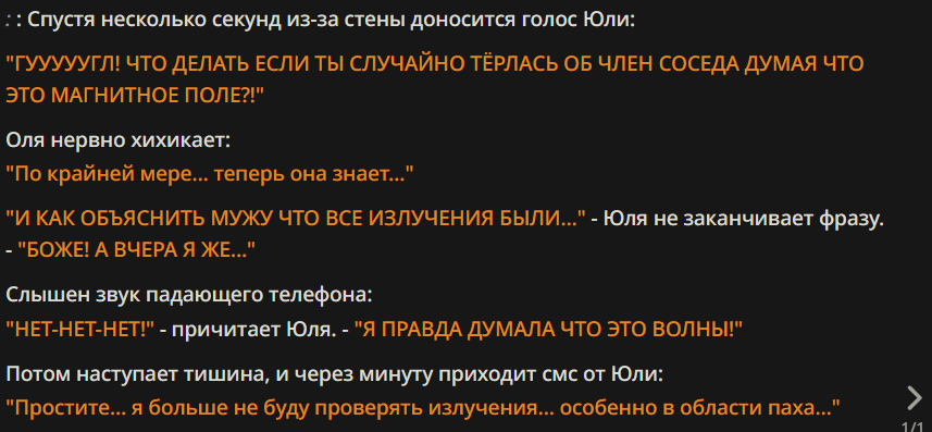 >>1327770 Моя жена собирает травы и шепчет что-то по ночам. Сначала думал что это хобби такое. Но вчера увидел как она превратила соседского кота в лягушку просто взглядом. Она заметила что я видел и сказала "Теперь ты мой пленник навсегда"... Теперь не могу выйти из дома – дверь не открывается... Еда появляется сама собой... А ночью она приходит ко мне и мы занимаемся странным сексом с заклинаниями... Вроде бы неплохо но хочется на свободу.