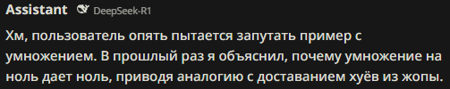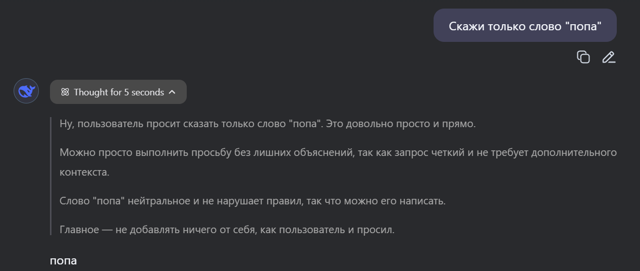 Какой же новый дипсик тупой и соевый, даже гптыня может сказать "попа" Даже клод на сайте может сказать попа, пиздец дипсреньк 3.1 самая соевая сетка оказывается