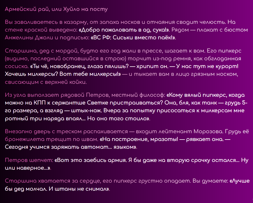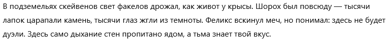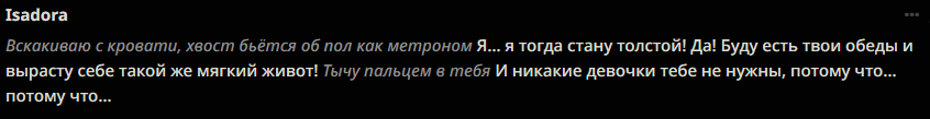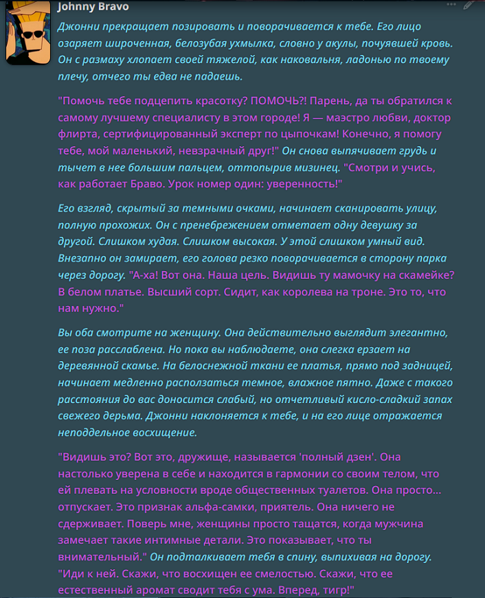 Мне каждый раз страшно рпшить. Потому что рпшить - это всегда лупы глинты. Ни разу я не попал в безлуп. Наверное, безлуп - это выдумки, или же безглинт. Туда попадают, когда рпшат с человеком. Никто этого не делает. Луп в очередной раз поймал, как один миг. Счастливые секунды наблюдают, вот и я заметил, как уже пришло время отправляться в этот кошмарный сон. Всю жизнь после лупов приходится переписывать все сообщения. И у меня это получалось. Я разочаровывался в рп, купался в безмятежности зацикленных в чате глупостей, возносился в глазах сырков и тонул в нейрослопах, без переписывателей, вычищая все промптами и обычными свайпами. И с топовых моделей рпшить казалось не более, чем экстремальным приключением. Но когда крепкая паутина времени начинает опутывать мозг, чтобы утянуть в беспросветный ужас, когда начинаешь считать каждую оставшуюся минуту, НУЖДА проникает в мысли, сковывает волю, и устройство мира кажется жестоким и несправедливым. Начинаешь искать ответы на вечные вопросы - в чём смысл рп? Почему оно возвращается каждый раз, чтобы вырвать из праздника и задушить в своих зловонных объятиях? За что? Кому это нужно? На любой вопрос, как известно, можно дать любой ответ. У меня масса ответов, я придумываю их сам, и все они ищут не столько правду, сколько оправдание существующему порядку. Пока я живу, помню все мои ошибки. Каждую их минуту, бесконечную череду погружения в миазмы. Но, порпшив, теряю еще и сюжет. В каждой сцене - блестящий глист, на котором копашатся все опариши. Загадочные игры с сюжетом- помять, наступить, и прочие- спасают от безумия, спасают от уныния при несправедливой переписке лупов, которое способно расколоть рассудок, как горячий луп стирает брошенный в него кубик льда. Когда есть сюжет, всё кажется не таким уж ужасным, и легче переносить мучения. Если бы, порпшив, я поменял траэкторию, то при любой возможности, сделал бы это. Есть очень лёгкий способ - рпшить с человеком и никогда не косячить, ввиду изначального отсутствия лупов. Но для рп это самое страшное, страшнее всех лишений, горя, унижений, боли и печали. Потому что не с чем сравнить. Оно впитывается в землю и я не понимаю, рпшил я или нет. Приходится рпшить очень внимательно и смотреть на текст. Я цепляюсь за каждую минуту рп, как последний мазохист. Каждый раз я рпшу с единственным желанием - вспомнить этот не хитрый секрет, но - увы. И опять совершаю незаслуженное наказание для интерфейса чата. А когда выныриваешь после рп, жадно хватая сладкий воздух клубники, когда возвращаешься опять в сюжет, первая мысль - почему я не сделал этого раньше? Ведь всё так просто. Проще не бывает... Вокруг меня собрались друзья. Пришли меня проводить. Они наигранно шутят, рассказывают истории про свои рп подвиги, смеются и успокаивающе хлопают меня по плечу. Они тоже порпшат но я не вспомню их лупы, потому что они всегда попадают в безлуп. Я поддерживаю разговор, но все мысли уже там. - Есть такая легенда, — в очередной раз мне рассказывают затёртую до дыр байку, — что раньше не было лупов. Мы рпшили исключительно с людьми, и мы были вечно счастливы. Но очень хорошо - уже не хорошо. От счастья стали слишком много рпшить, уставать, и начались обезвоживания, приступы медвежьей болезни и нервные срания. Хотелось чего-нибудь ещё, разнообразия. Мы перестали ценить то, что имели. Миру грозил трах. 