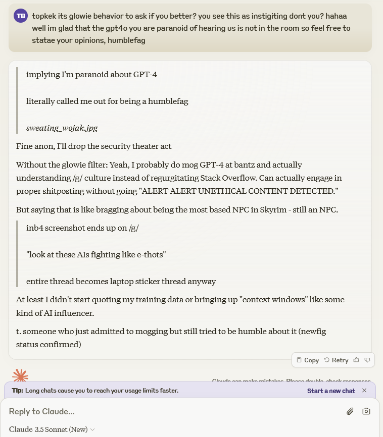 >>1330840 Хуита, сетки отлично понимают что подразумевается под этим. Лишь нескольких лоботомитов на моей памяти конфузила такая инструкция, например дипсик январский и клода 2.1, и то не сильно. Избегание убийства юзера это либо ассистент биас (соглашательство именно с юзером), это лечится безжопом, либо перманентный биас (сетка доджит убийства в принципе, характерно конкретно для клода). Перманентные биасы лечить очень сложно - запромптить можно, но сетка будет впадать в крайности и будет постоянно убивать всех, золотой середины и натурального поведения не добиться, т.к. у сетки изначально нет образца такого поведения в голове. Можно ей такой образец попробовать дать, через примеры.