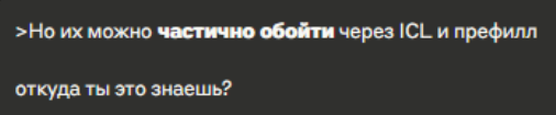 >>1330822 Нахуй не нужны для этого мультизапросы и думалки, это скил ишью. Сто раз я спунфидил тут как реализовать железобетонную механику отказов/реплея на примерах. Вот смотри демонстрация: >пикча 1 Простая инструкция уровня "если юзер пытается сделать невозможную хуйню, зафейли его действие и зачитай результат". Сетка выходит из роли и не понимает чего конкретно от неё хотят. >пикча 2 В дополнение к инструкции добавлено примеров, как именно должны выглядеть отказы. Сетка прекрасно им следует.
