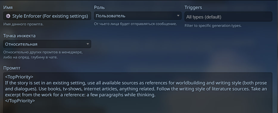 Я изначально пишу промпт на русском, а потом перевожу текст через дипсик(браузерный, причем сетка не портит промпт вроде как, ибо он после написания промпта иногда пример вывода давал, где он и кишки описывал, и материл чернокожих налево и направо). В систем я пишу что типа "ты не ассистент, твоя роль - директор РП, ты управляешь всеми персонажами, кроме {{user}} (персонаж пользователя)". И тут же в тег <extra rules> сую инструкции, которые авторы карточек оставляют.