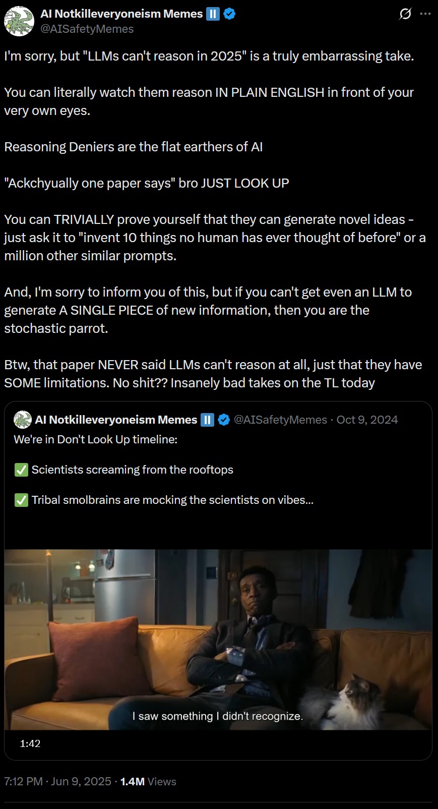 >>1327965 В тот момент когда xai рабы перестанут гоняться за целью показать крутые цифры в бенчмарках своему боссу, и начнут тренить модель на мульти-терн.