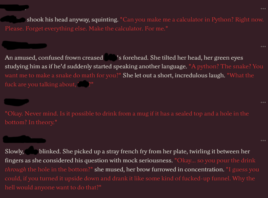 >Если это делается вручную, то нах он нужен? Ну сиди с лоботомитом тогда. Если ты ожидаешь высрать "я тебя ебу", он тебе в ответ стену текста, и так 300 раз, я тебя разочарую, как раз на длинных и сложных РП проявляются все проблемы сеток.