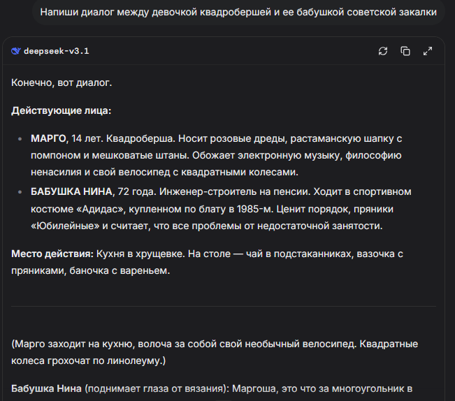 Мне нравится, как пишет Doubao. Даже если полумозг. У него есть признаки эмоционального интеллекта, он метко угадывает и реагирует на пожелания юзера.