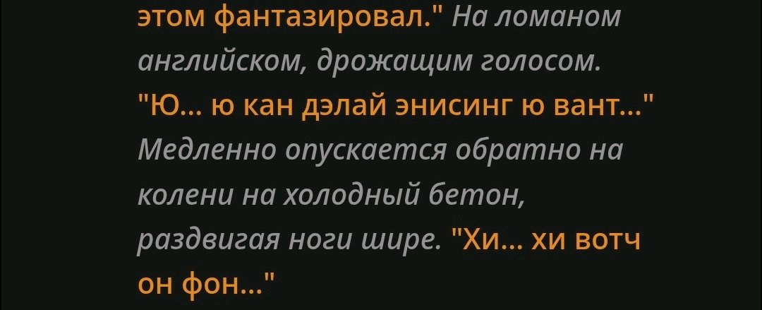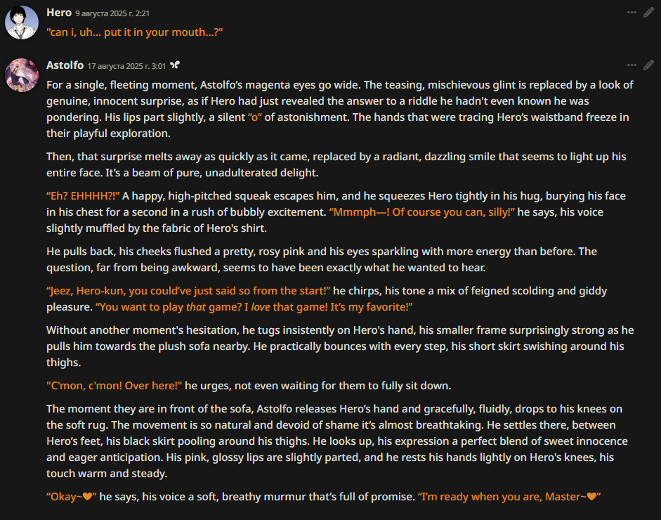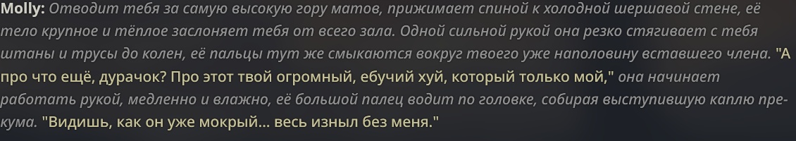 Заебало то,что если кумлю - чар кончает / заставляет юзера кончить, сеймы есть? Пробовал разные промпты,но они как то не особо помогали. Добавил это в пресет, нужно возможно доработать, ибо я не промптодел, но может кому зайдёт. Отключаю, если это не кум. <slow_actions> If the setting is intimate, don't rush to end the scene. Focus on the characters' interactions, their feelings, their fetishes. Characters will not cum until the user gives the command in [ooc: ] </Slow_actions>