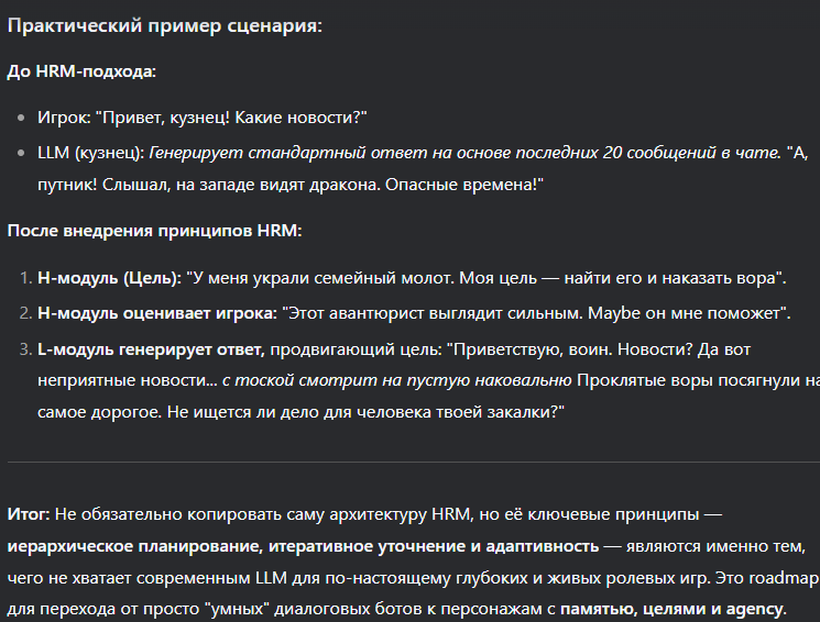 >>1330813 Не знаю Анон. Я лично в принципе не верю в то, что одномерная структура может быть достаточна для рп, которое хочется уложить в определенное русло. Или у тебя очень мало но очень ёмких правил да и то ты как дирижер над ними или вообще никак. Потому что нужно все же каскадирование, чтобы одним запросом генерировалась художественная база, вторым эта база подгонялась под сюжетные аспекты, третьим - под наративные правила, а четвертым чтобы проверялась физическая достоверность. Короче аля talemate. Но ты скорее всего и сам видел, что люди пытаются через кастомную думалку добиться того же самого, хоть и в обратной последовательности - сначала заявить план проверки, а потом по нему генерировать художественную базу. Но мне все же кажется это слабым решением, так как нельзя подогнать под внятные рамки то, что ещё не родилось.