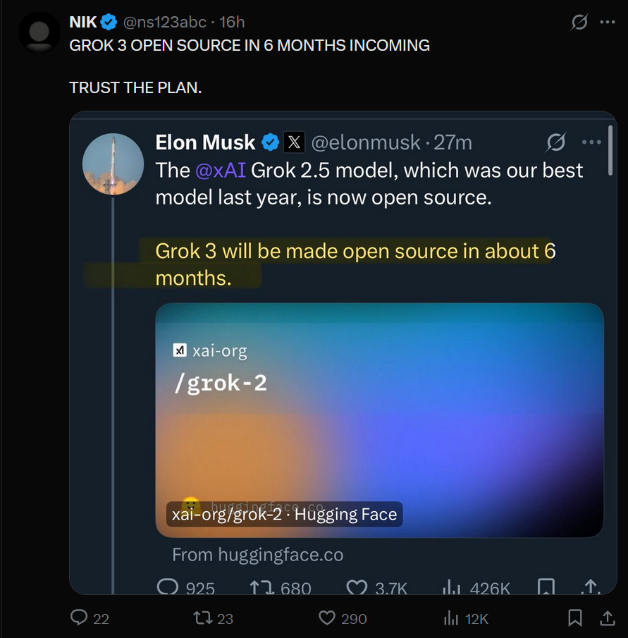 >>1330518 Маск молодец на самом деле, что выпустил (дарио пидорас никогда такого не сделает). Грок 2, кстати, если бы не лупился, был бы отличным середнячком в свое время. Еблю он писал посочнее многих сеток.